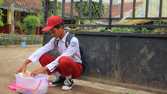 Di saat anak-anak lain tertawa riang di sekolah atau bermain di sore hari sepulang sekolah, Waryono justru harus berkeliling kampung membawa keranjang gorengan dengan seragam sekolah yang masih melekat ditubuhnya.
