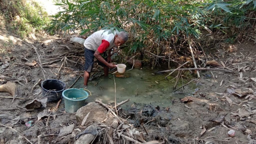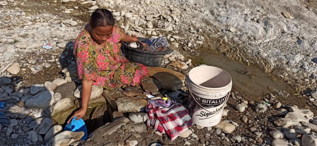 Sebagian Ibu lainnya harus mencuci pakaian di sungai yang perlahan mengering.