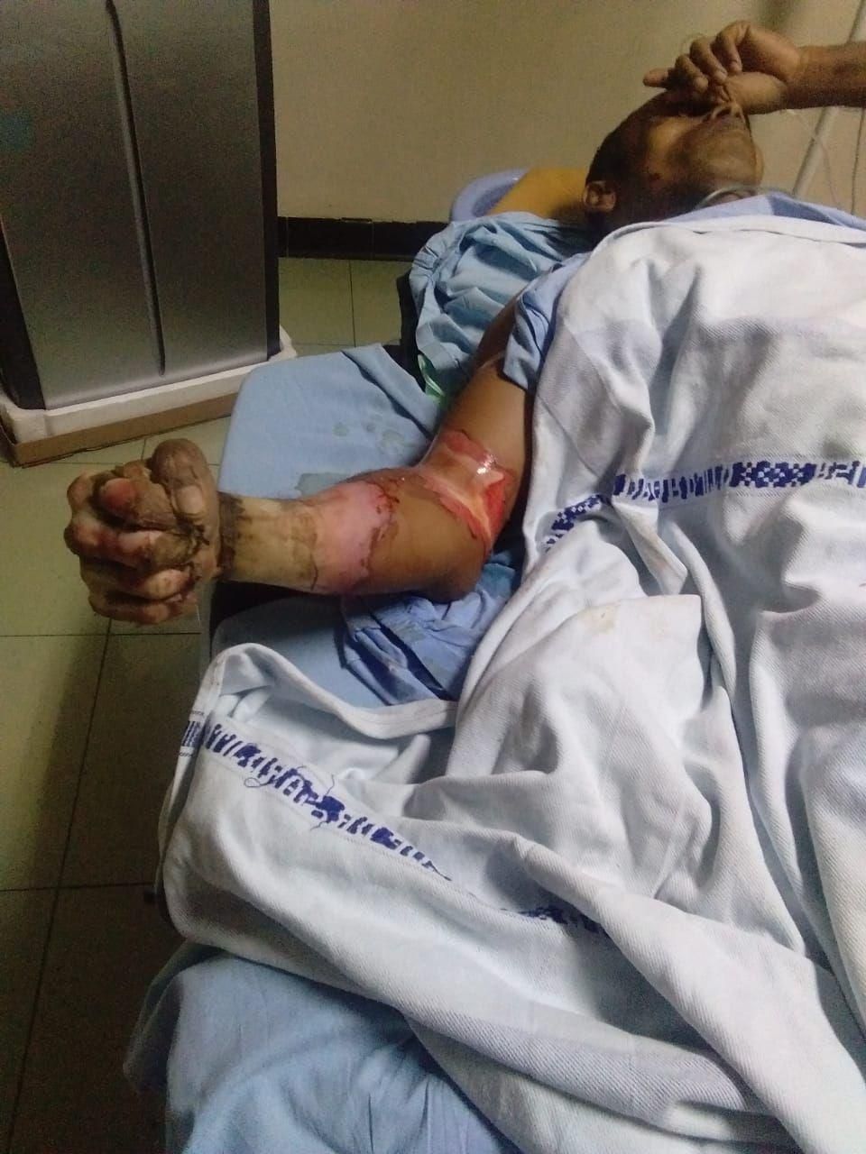 Pak Nur mengalami luka bakar. Tangan sebelah kanan kaku karena dalam posisi menggenggam, serta bagian lengan kaku tak bisa bergerak dan menempel dengan ketiak.