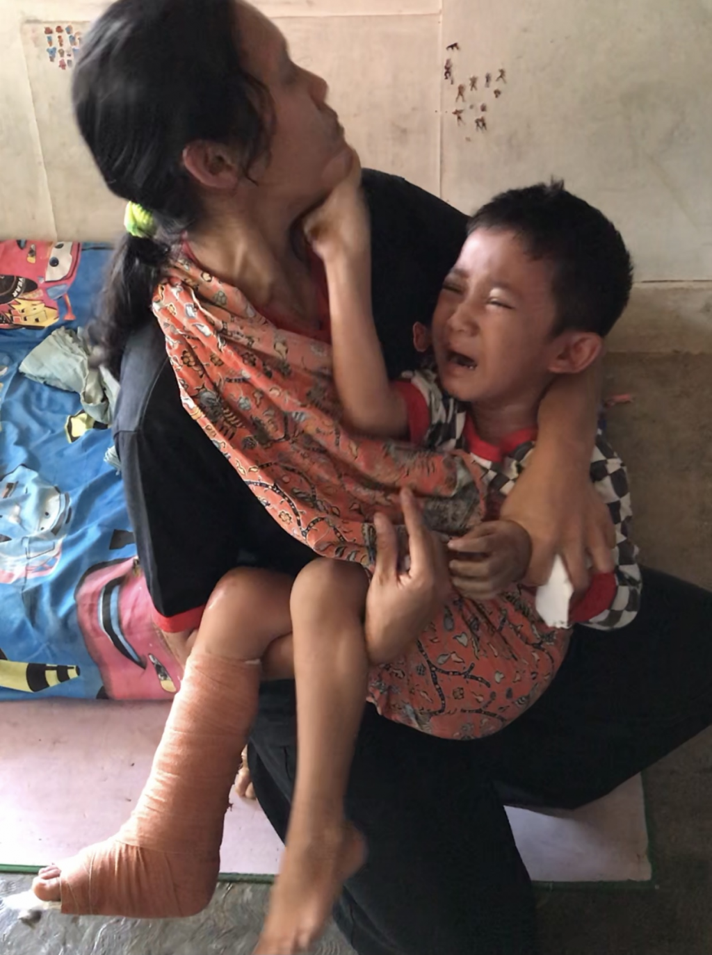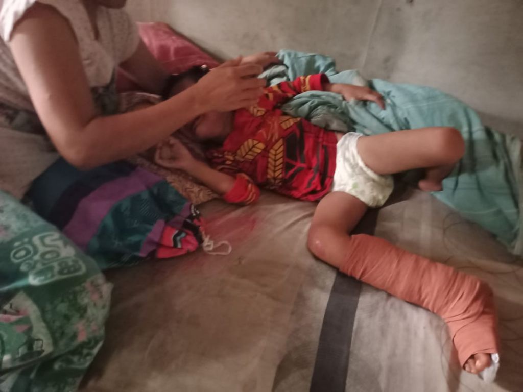 Tiap hari Rizky sering menangis karena sakit pada kakinya. Luka pada kaki Rizky masih belum kering dan mengeluarkan nanah. Kedua orangtuanya pun tidak dapat berbuat banyak untuk mengobati anak bungsunya tersebut.