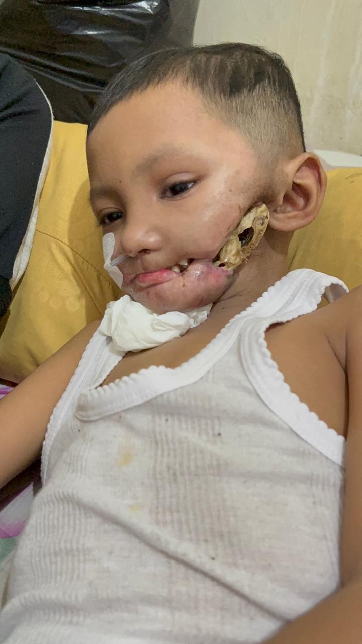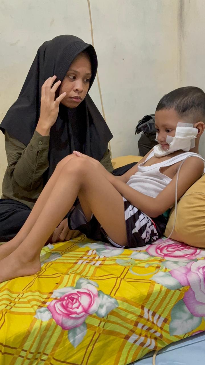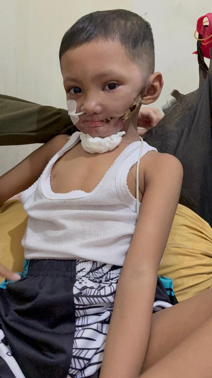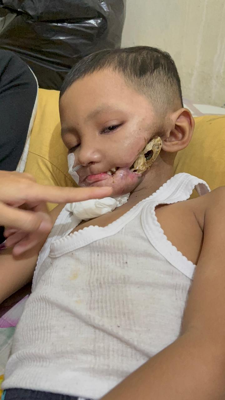 Aldi (6) menderita kanker mulut yang tumbuh dengan cepat, sel kanker bahkan tumbuh besar sampai memenuhi rongga mulut bahkan keluar dari mulutnya.