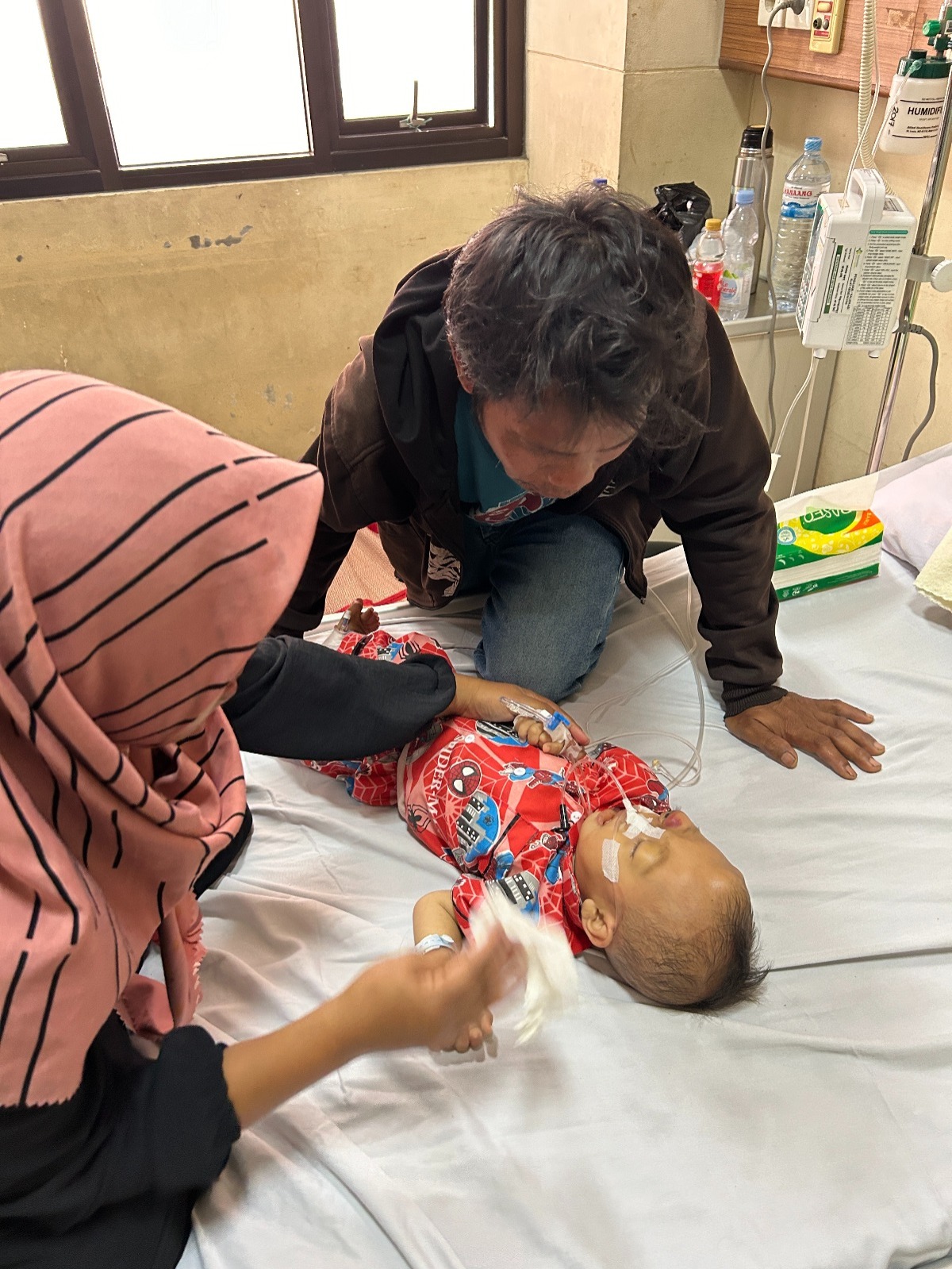 Terkadang saya bingung dan sedih saat Aris semalaman tidak tidur dan ketika makan Aris selalu menangis menahan sakit. Tak tega namun mau gimana lagi, saya ingin Aris sembuh dan bisa bermain seperti anak-anak lainnya."- lirih Ayah Aris