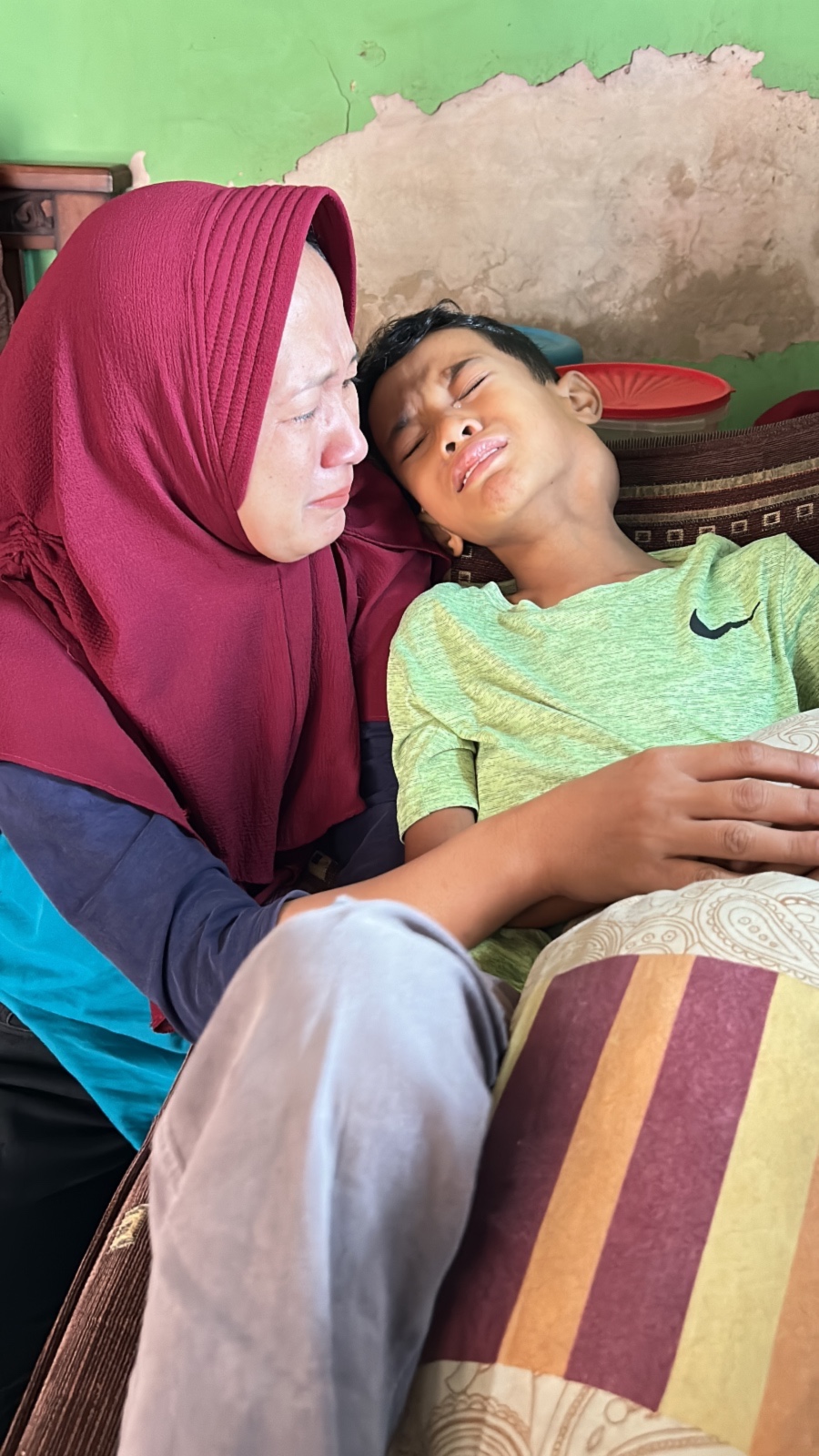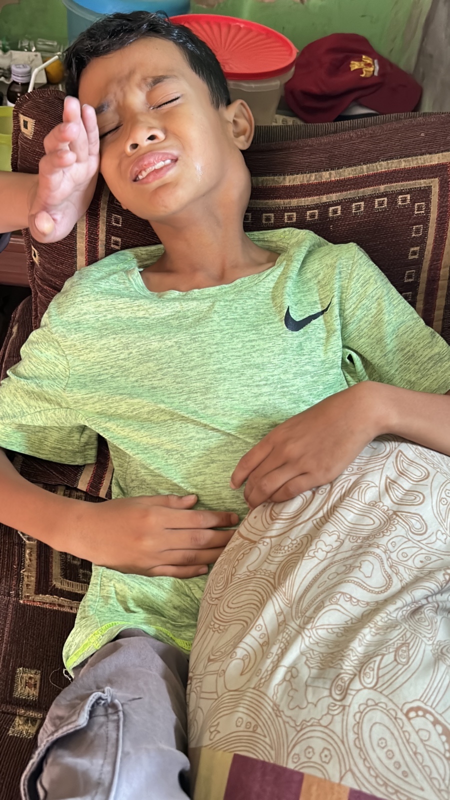 Dik Azka,menangis menjerit kesakitan,ia tak bisa bermain seperti anak-anak lainnya. Makan pun sulit. Dik Azka hanya bisa menangis dalam pelukan Ibu untuk menahan Rasa sakitnya.