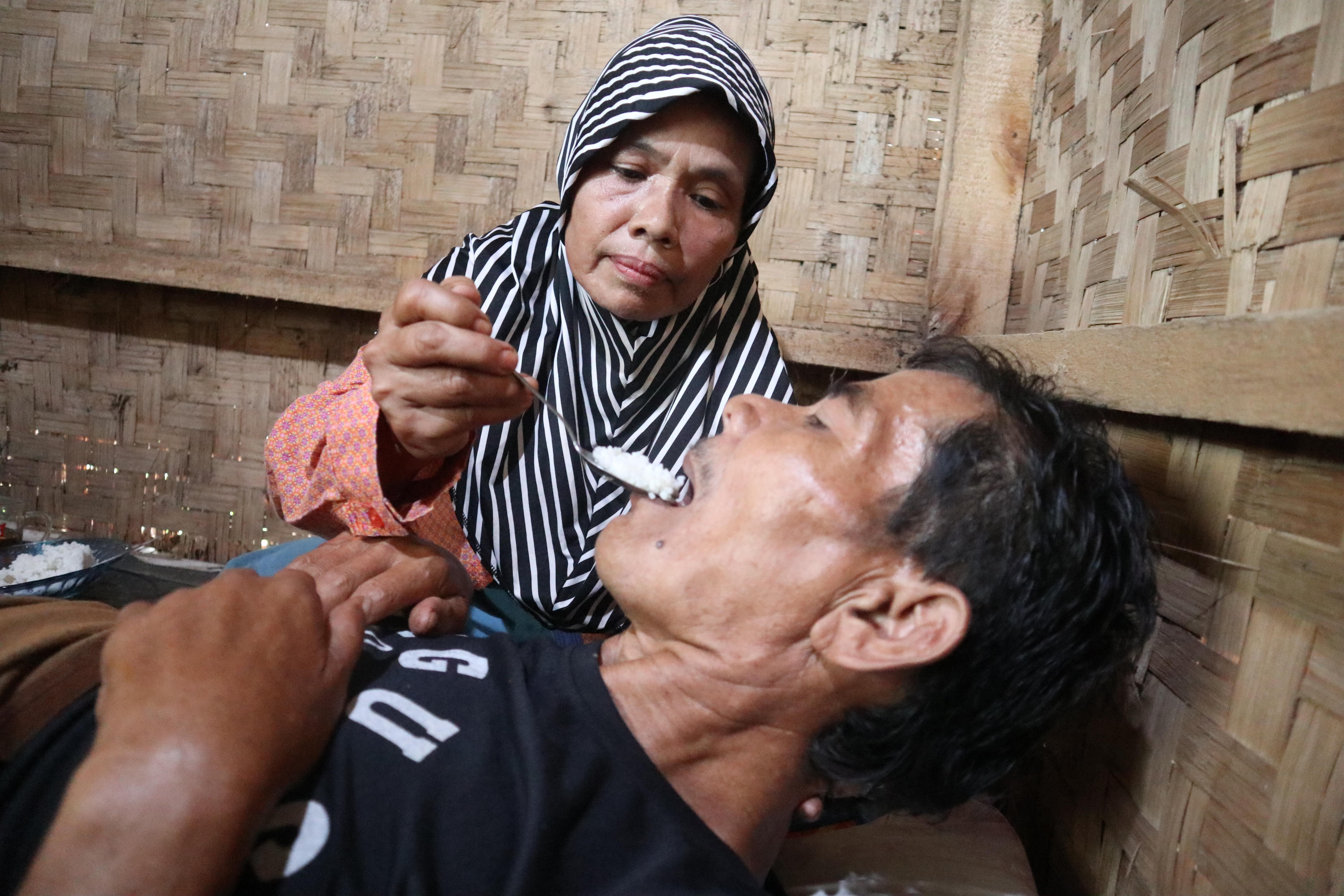 Suaminya Pak Usep (53) menderita penyakit diabetes yang membuat kedua kakinya membengkak dan sulit berjalan. Dengan kondisinya yang mulai melemah ia hanya bisa berbaring di atas alas tikar dan bergantung dengan istrinya Bu Ihat.