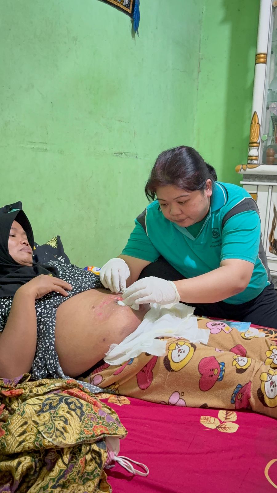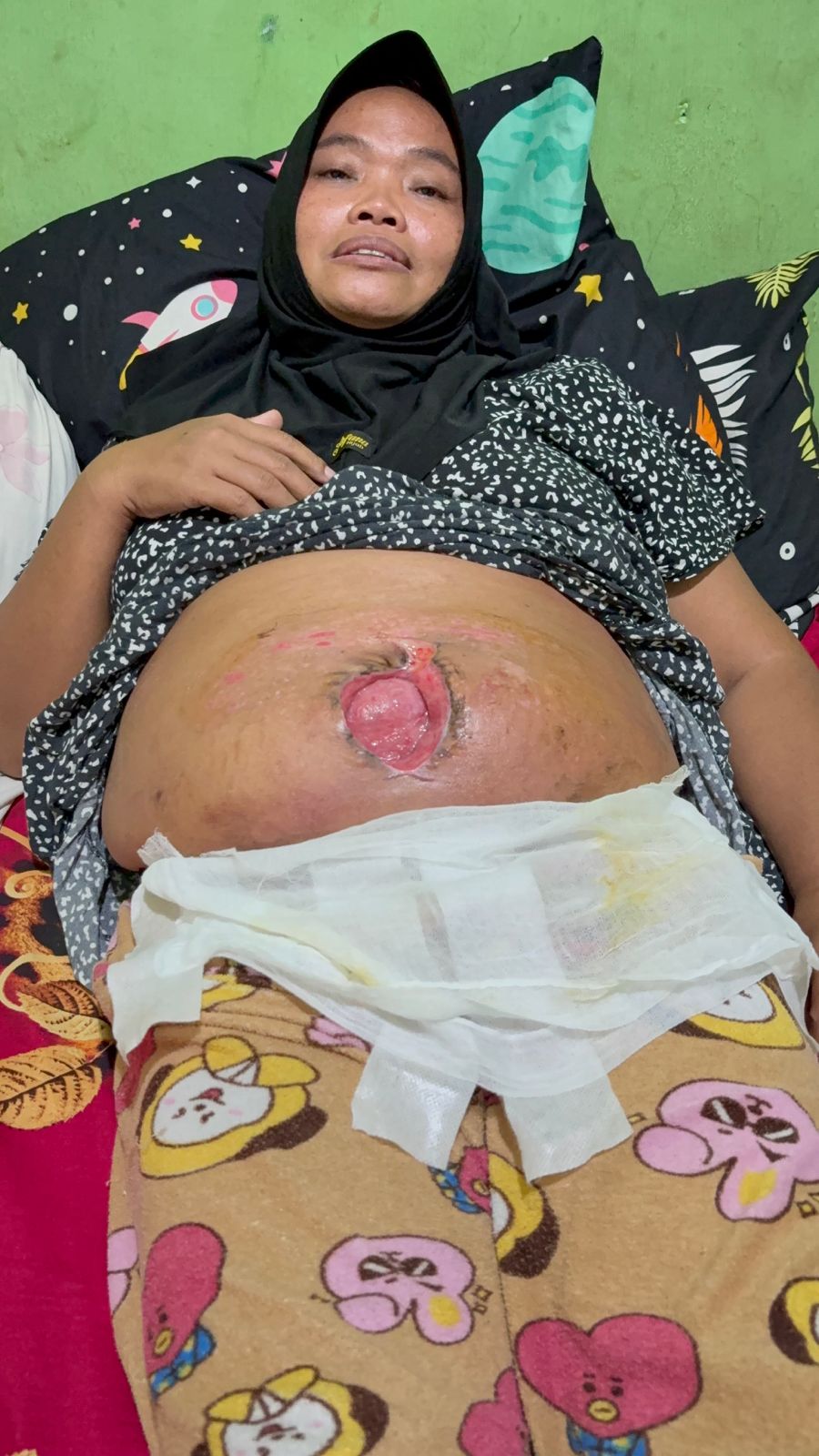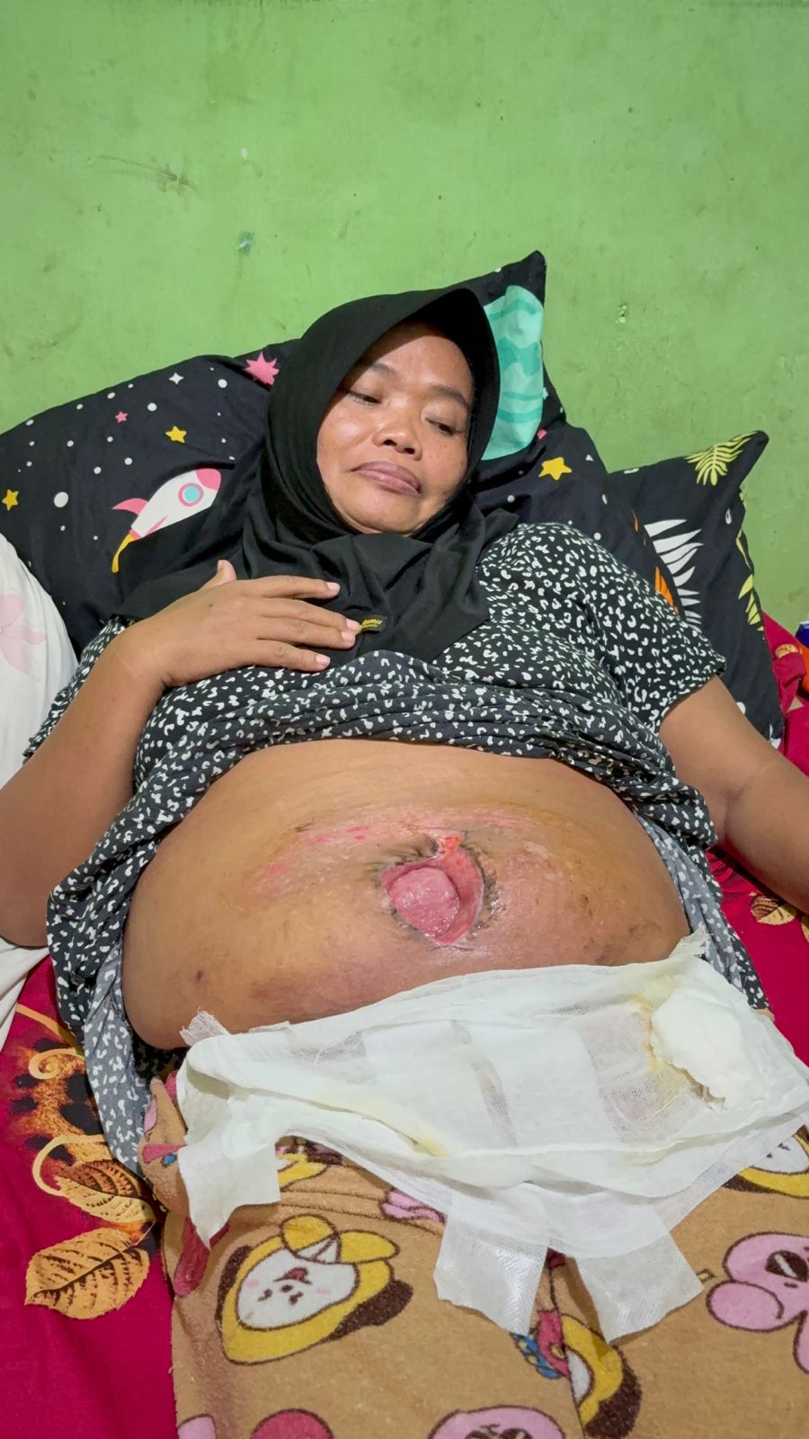 Bu Sumarni yang selama 3 bulan ini menahan sakit yang amat sangat,luka di perut bolong hingga mengeluarkan bau tak sedap menyeruak di kala keluarga bu Sumarni membersihkan luka nya.