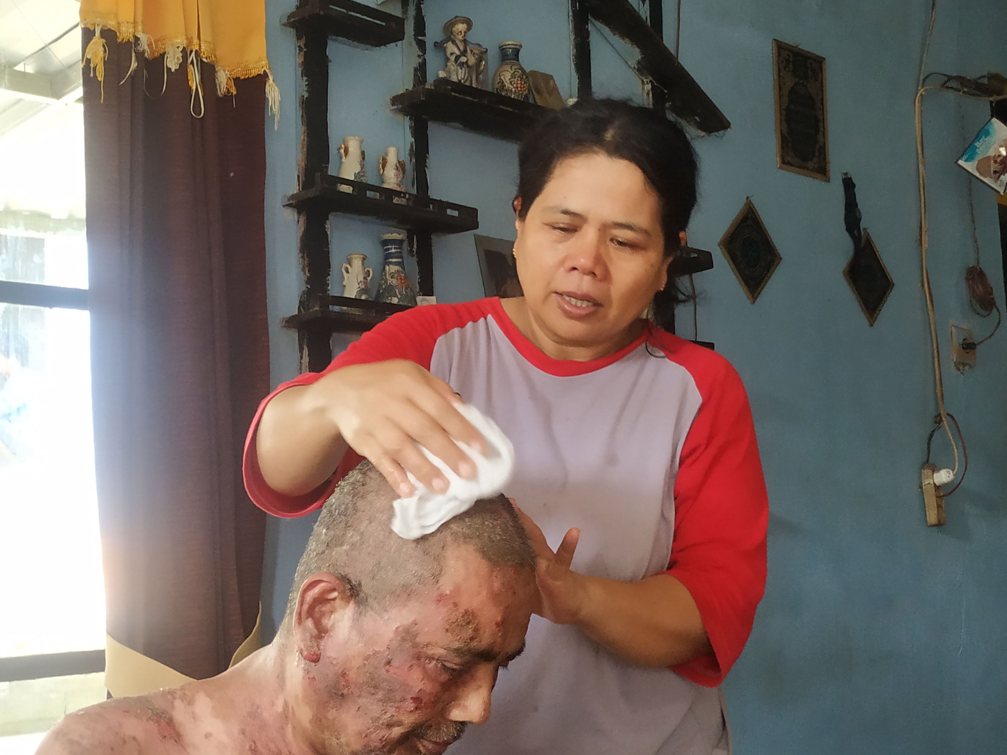 Beruntung ada sang istri Ibu Tuti (49) yang setia merawat serta berusaha meredakan perih dan panas di sekujur tubuh pak Asep dengan mengompresnya sepanjang hari.