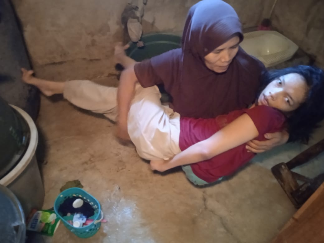 Mulai dari makan, berganti pakaian hingga mandi pun sepenuhnya Cica bergantung pada sang Ibu. Sudah 25 tahun Bu Cucu (50) mengurus dan merawat Cica yang di diagnosa mengidap Cerebral palsy.