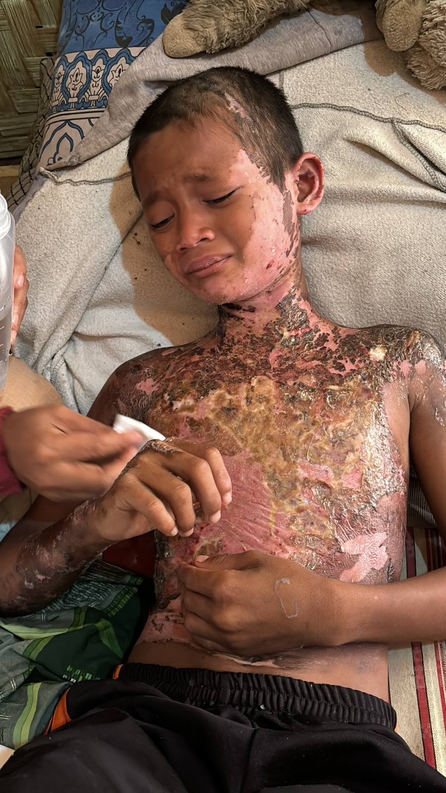 Seperti pasien-pasien dampingan kami yang mengalami luka bakar karena tersengat listrik,masuk ke dalam tungku api bahkan terkena minyak mendidih saat bermain..