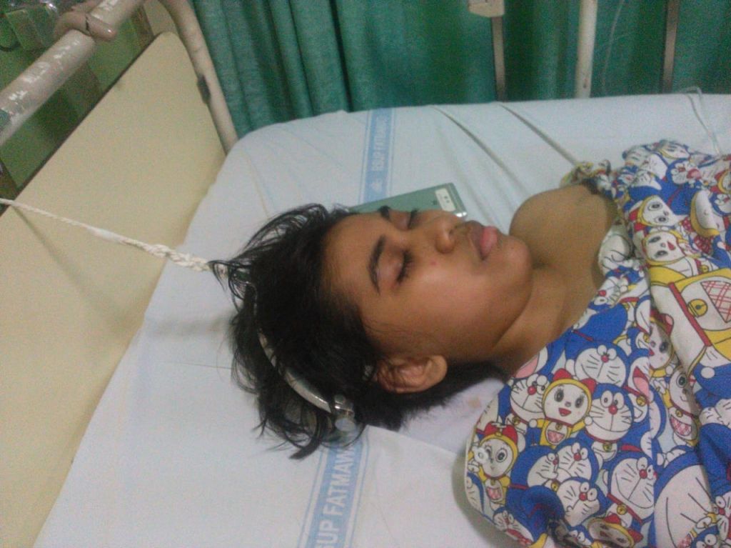 Lihat foto sebelah kiri. Tulang punggung dan iga nya sudah bengkok. Ia menderita skoliosis, yakni kondisi dimana tulang punggung melengkung seperti huruf S. Untuk menjaga struktur tulangnya, Fitra dipasangi alat penahan di kepala dan di kaki.