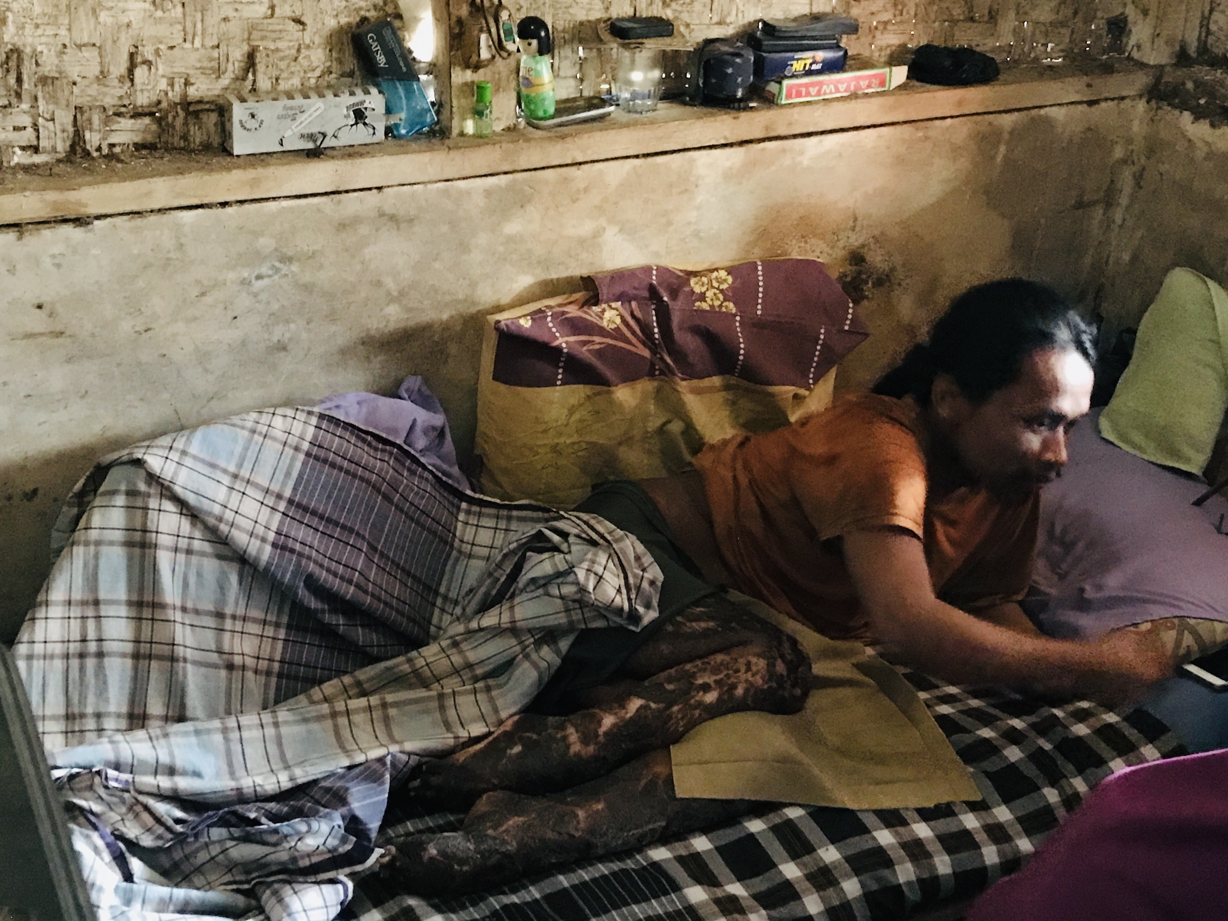 Kondisi Kang Tatang sangat memprihatinkan. Kakinya menghitam dan luka dimana-mana yang membuatnya kesakitan jika terkelupas. Jangankan untuk berjalan untuk duduk pun tidak bisa. Semua aktifitasnya harus dibantu. Bahkan Kang Tatang hanya mandi sebulan sekali.