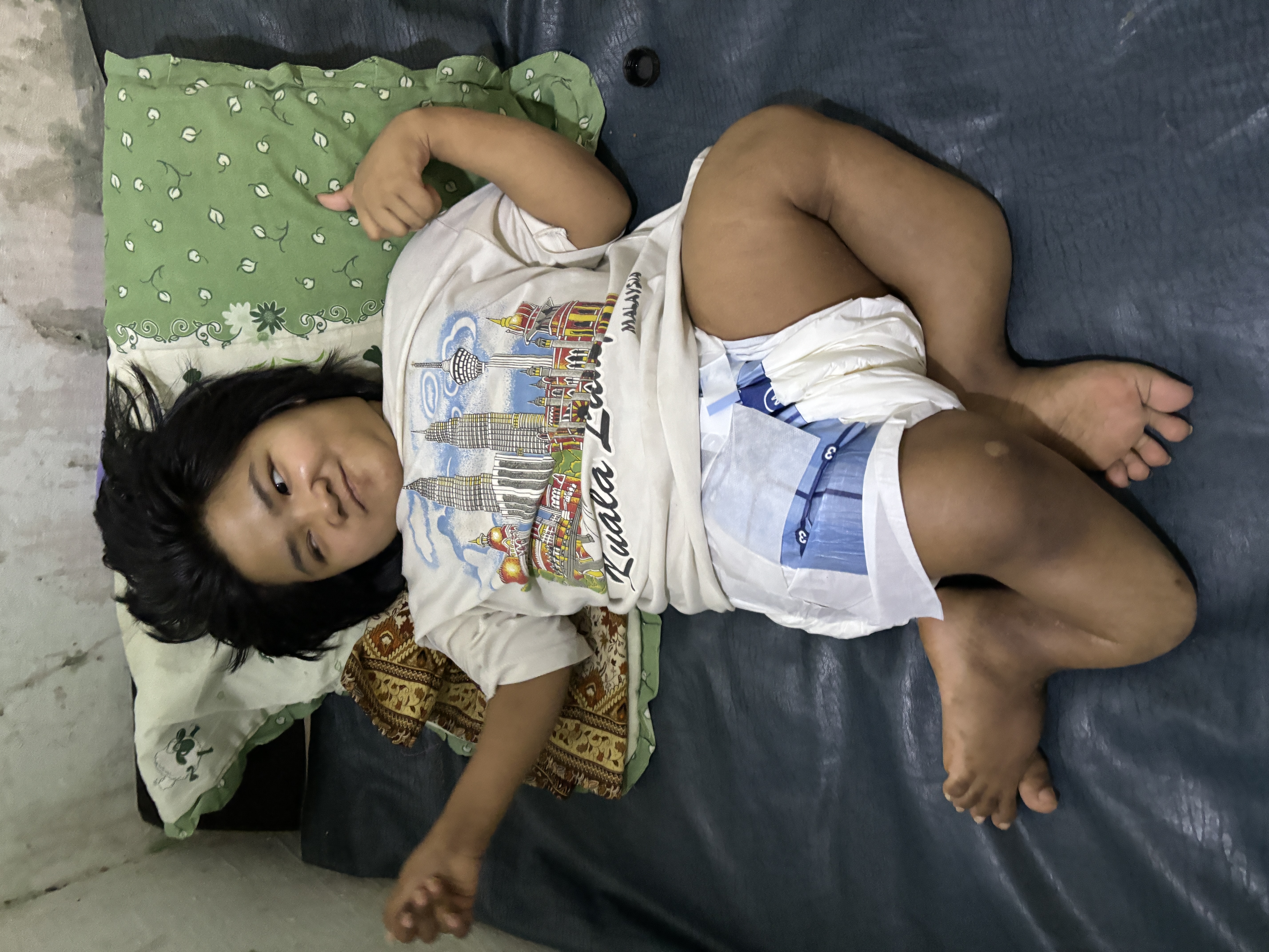 Kondisi Meisya saat ini sangat memprihatinkan, tulang-tulang kaki nampak patah, bengkok tak beraturan, tubuhnya pun hanya bisa terbaring dan tidak bisa melakukan aktifitasnya sejak kecil.