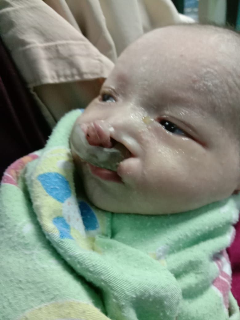 Nasya tidak memiliki langit-langit di rongga mulut, bibirnya sumbing, saya usap tangan dan kakinya, Nasya berbeda dengan bayi lainnya.