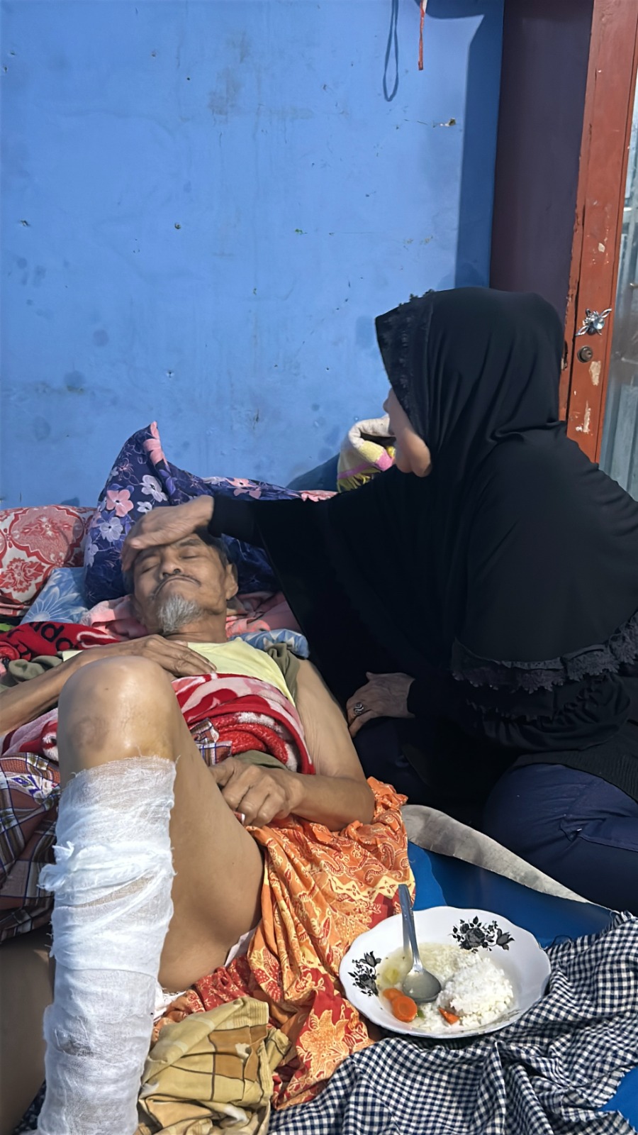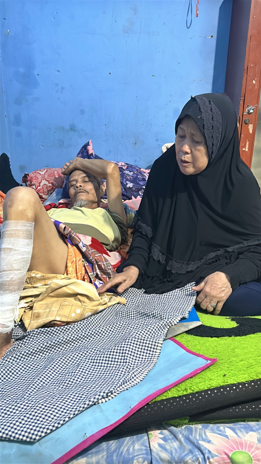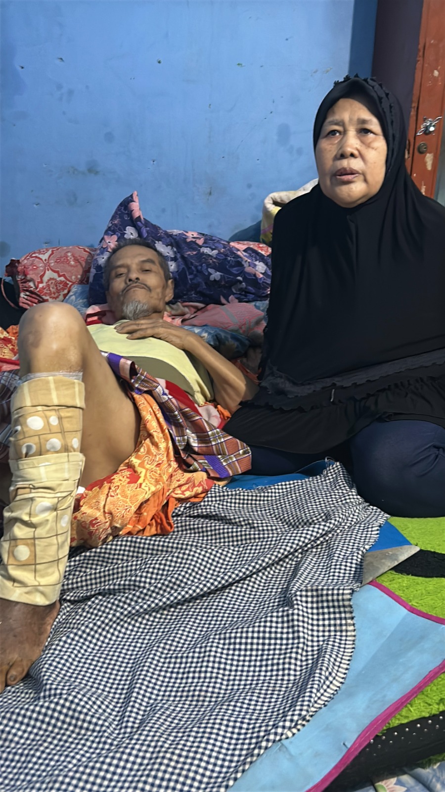 "Sekarang saya hidup dari istri saya yang jualan donat keliling buat beli beras dan obat saya karena kaki saya terus mengeluarkan nanah,saya juga ga mau merepotkan istri saya apalagi luka saya bau,kasihan istri saya. Saya berharap saat ini saya bisa berobat secepatnya agar saya tidak merepotkan istri saya."