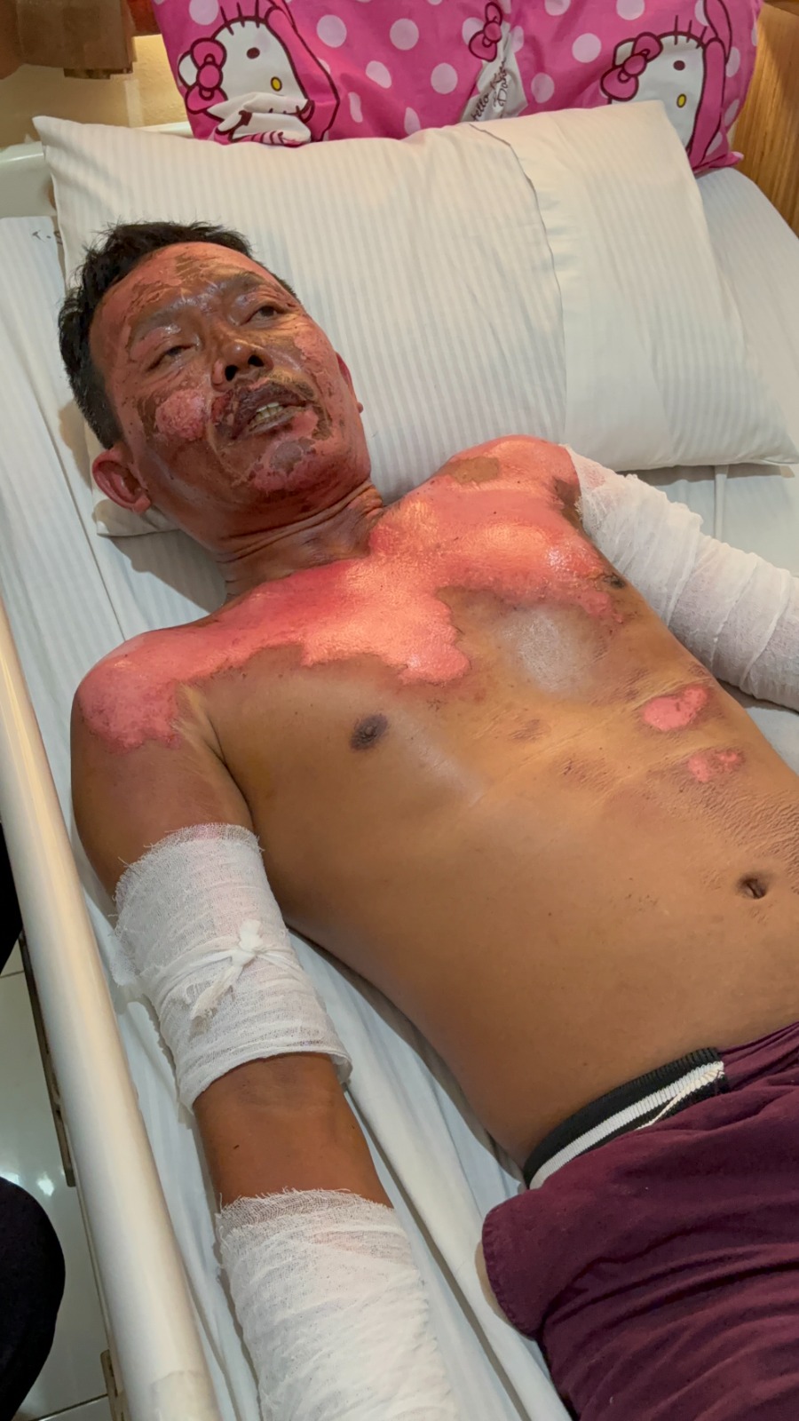 Seluruh bagian wajah dan tubuh pak Endang sudah melepuh terbakar. Istri pak Endang tidak kuasa menahan tangis melihat pak Endang yang saat itu antara sadar dan tidak.