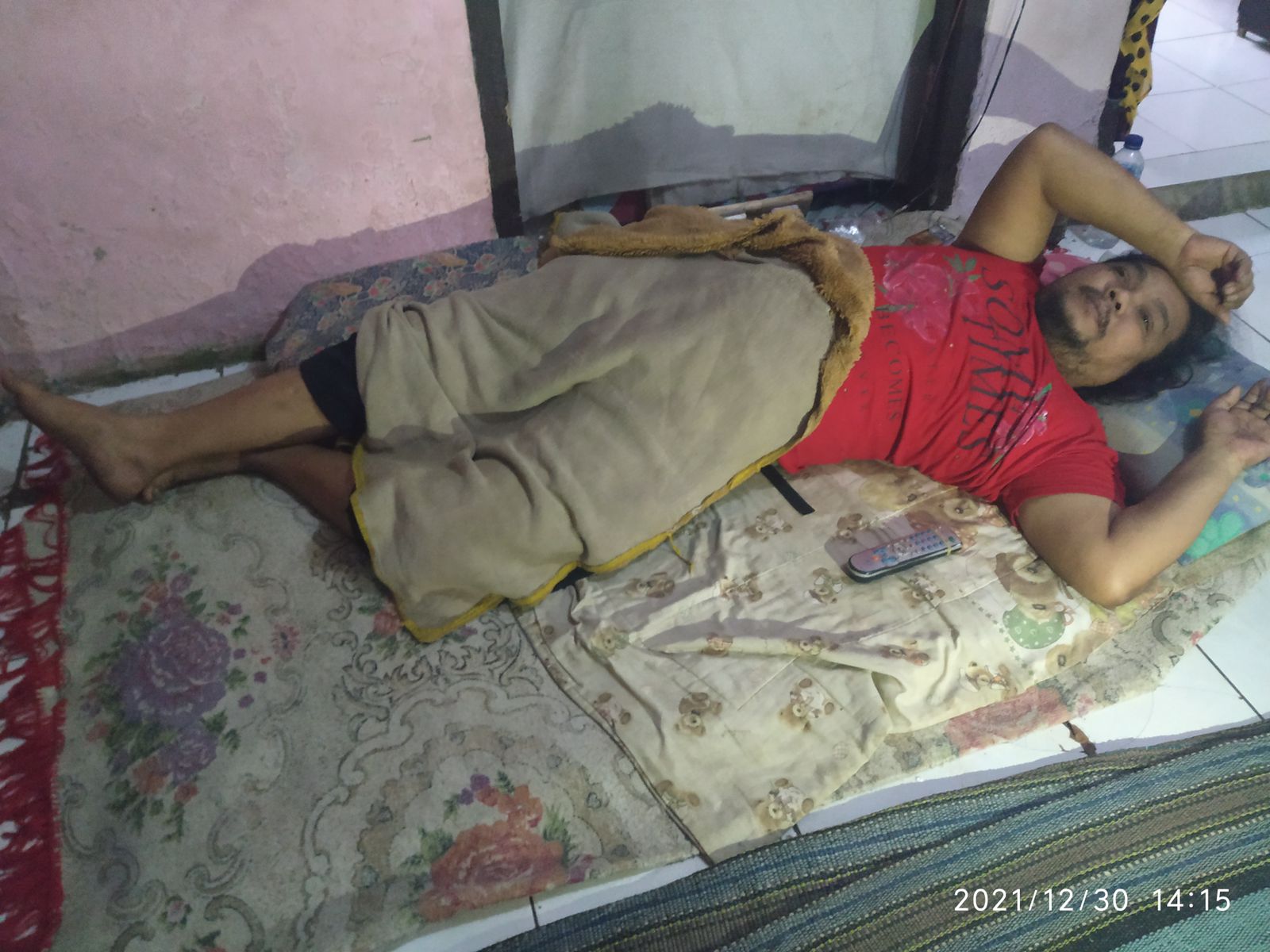 *"saat itu saya sedang menjahit seperti biasa, tiba-tiba ketika hendak berdiri kaki saya tidak bisa digerakkan dan punggung saya sakit sekali akhirnya sudah setengah tahun saya hanya bisa berbaring"kenang pak Jajang menceritakan awal mula ia menjadi lumpuh*.