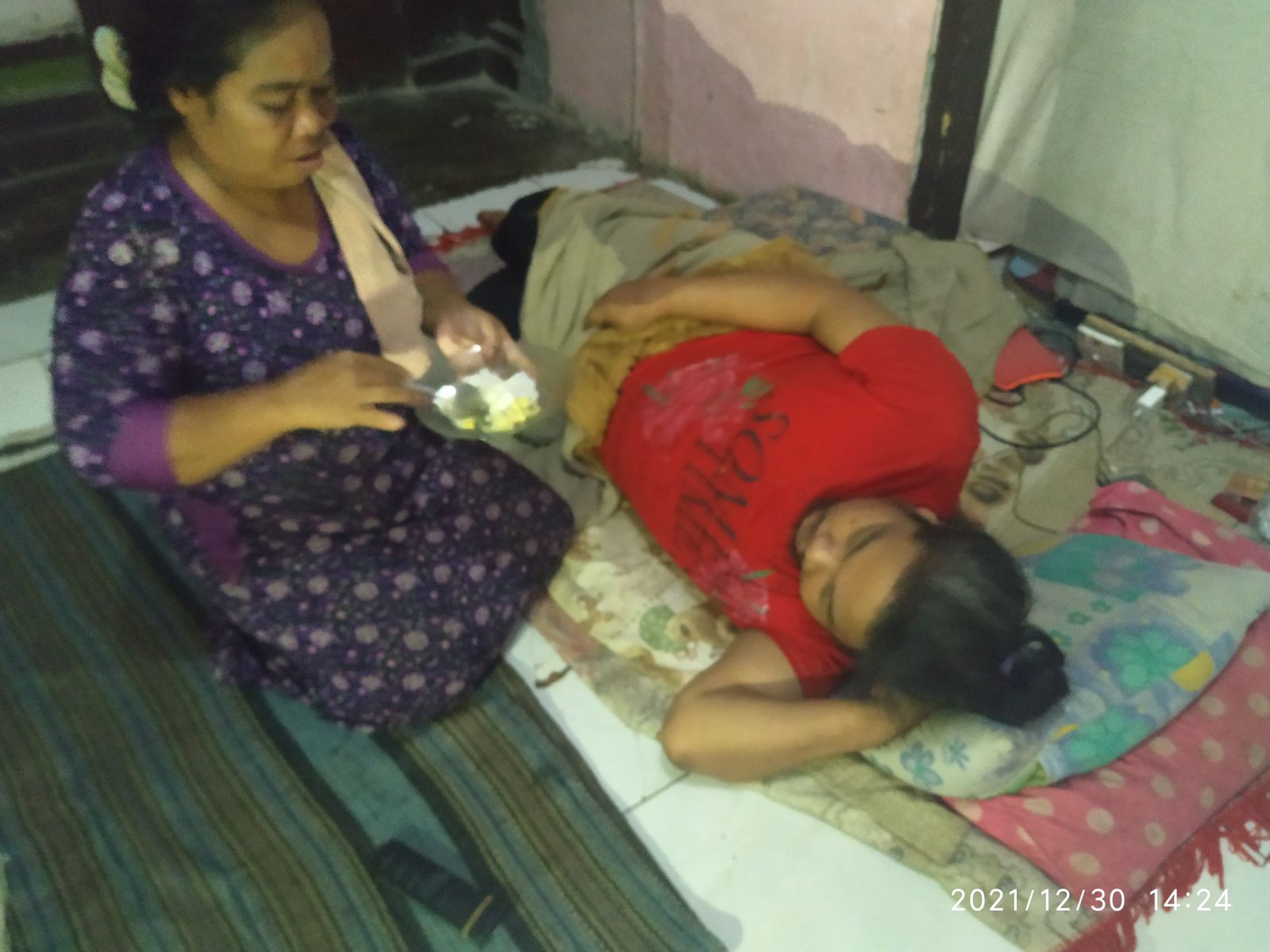 Kini untuk makan dan mandi pun pak Jajang sepenuhnya harus dibantu sang Istri Ibu Noneng (49th). Padahal selain harus merawat sang suami ibu Noneng harus pula merawat dan menjaga sang Ayah Abah Idit (88 th) yang sudah mulai pikun dan seringkali keluyuran pergi kemana saja.