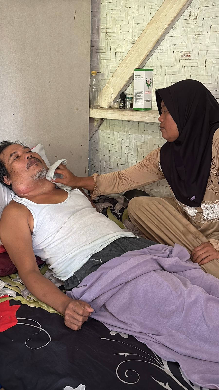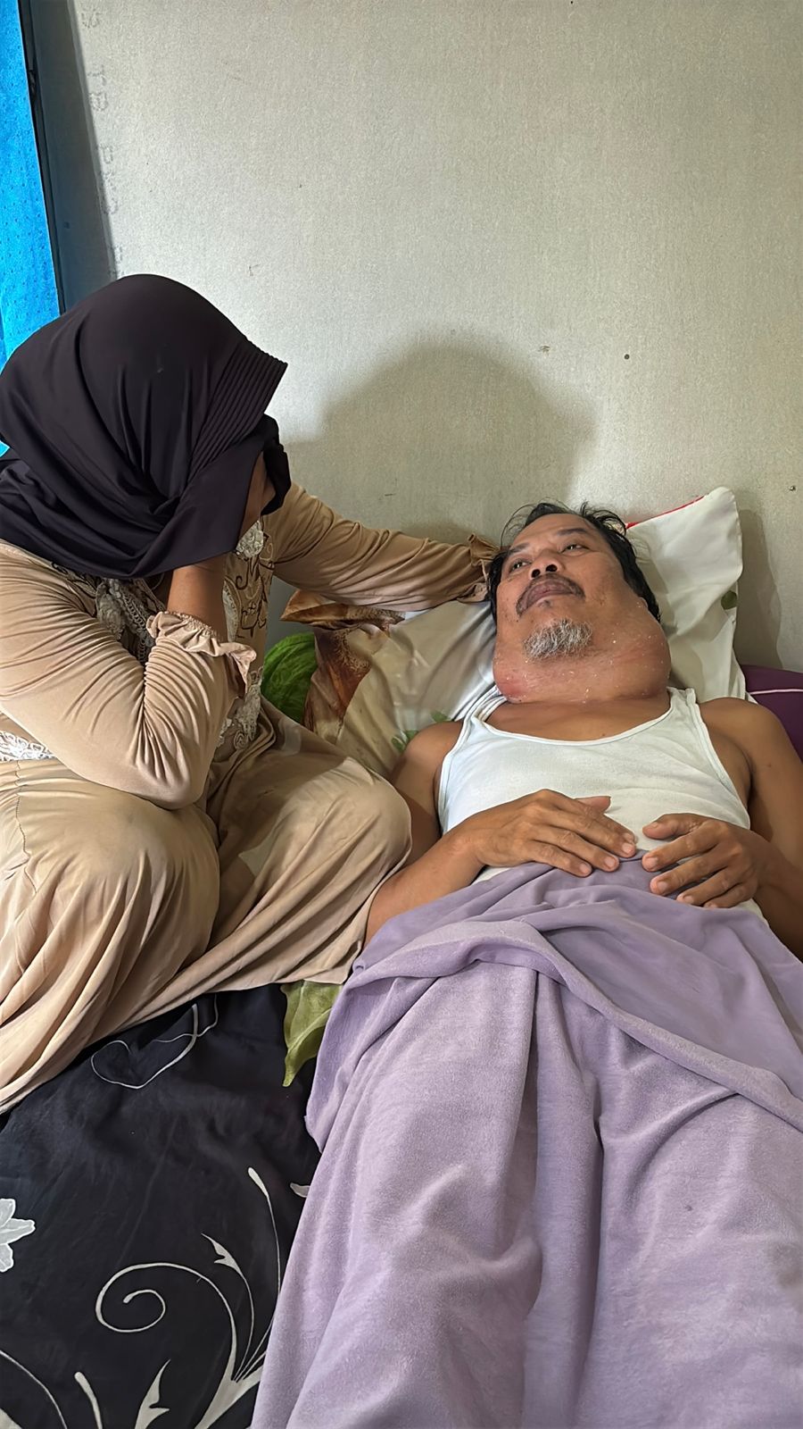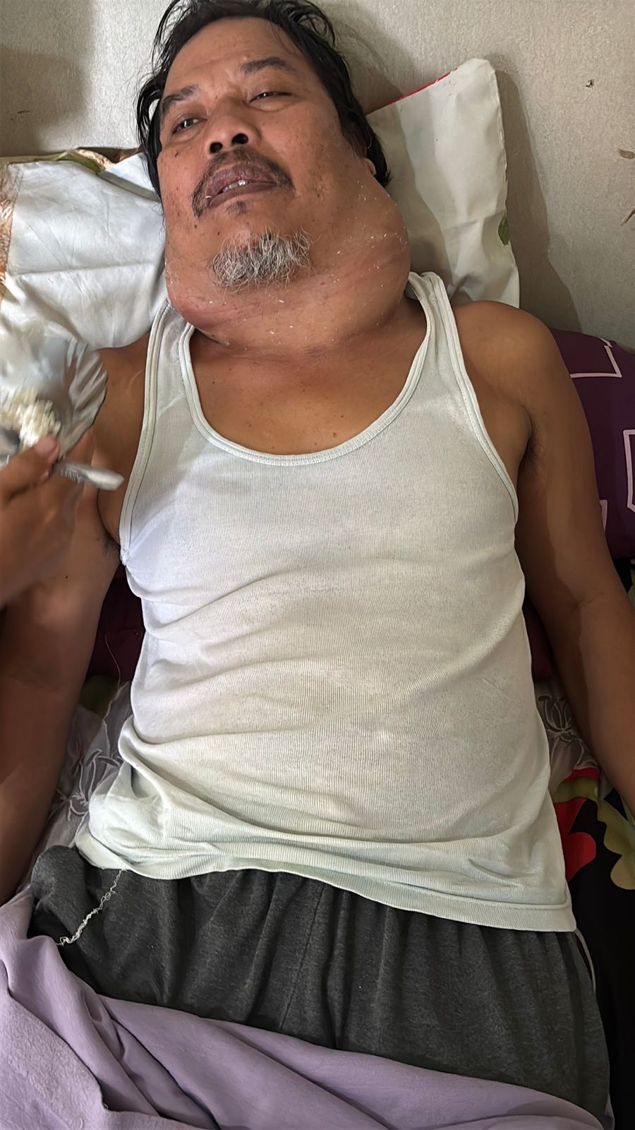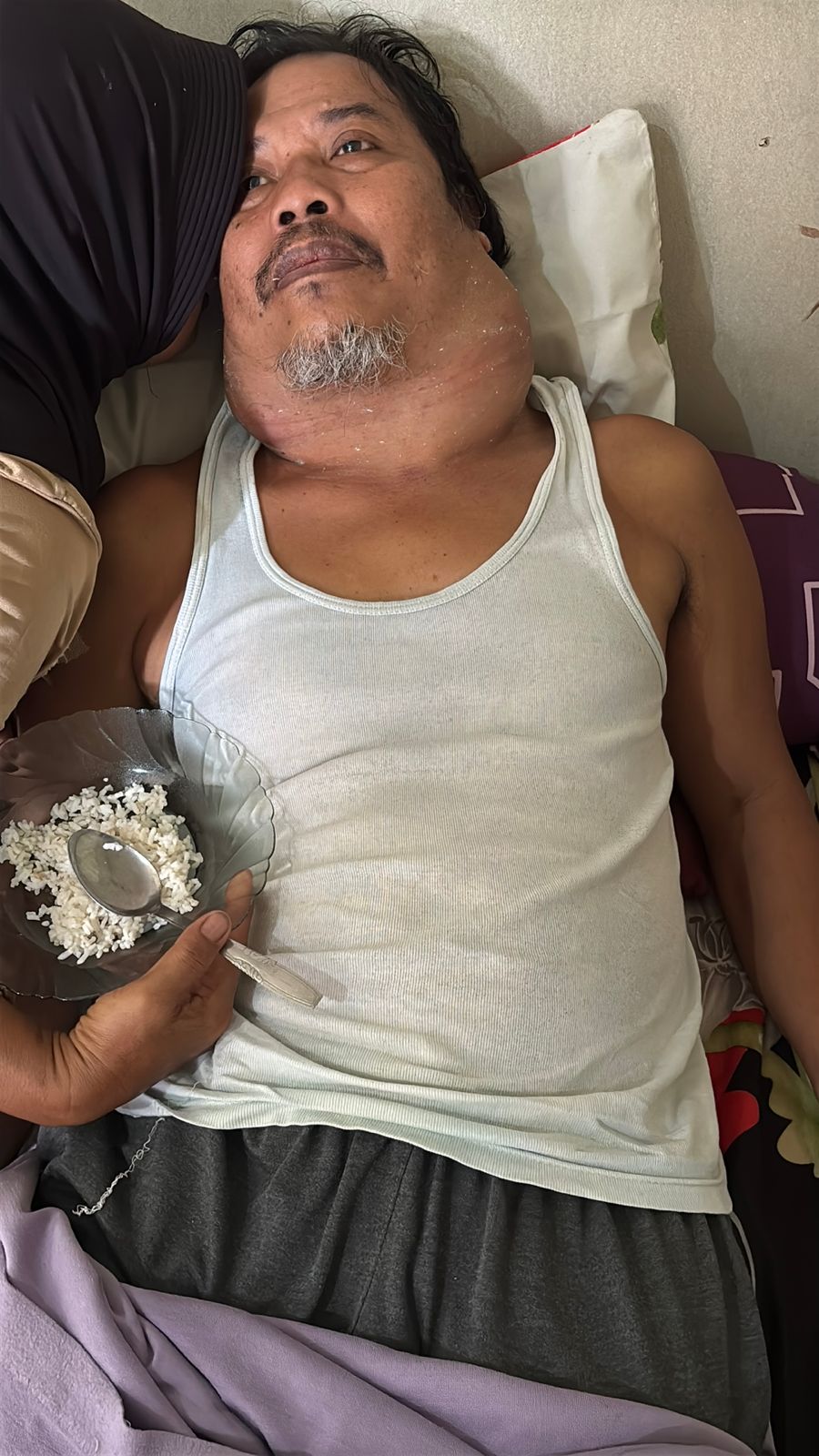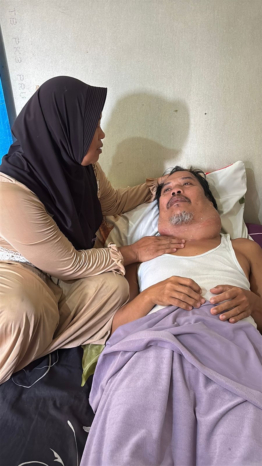 Pak Mamat menderita tumor besar di lehernya. Bahkan saat ini tumor itu bertambah hingga membuat pak Mamat sulit bernafas.