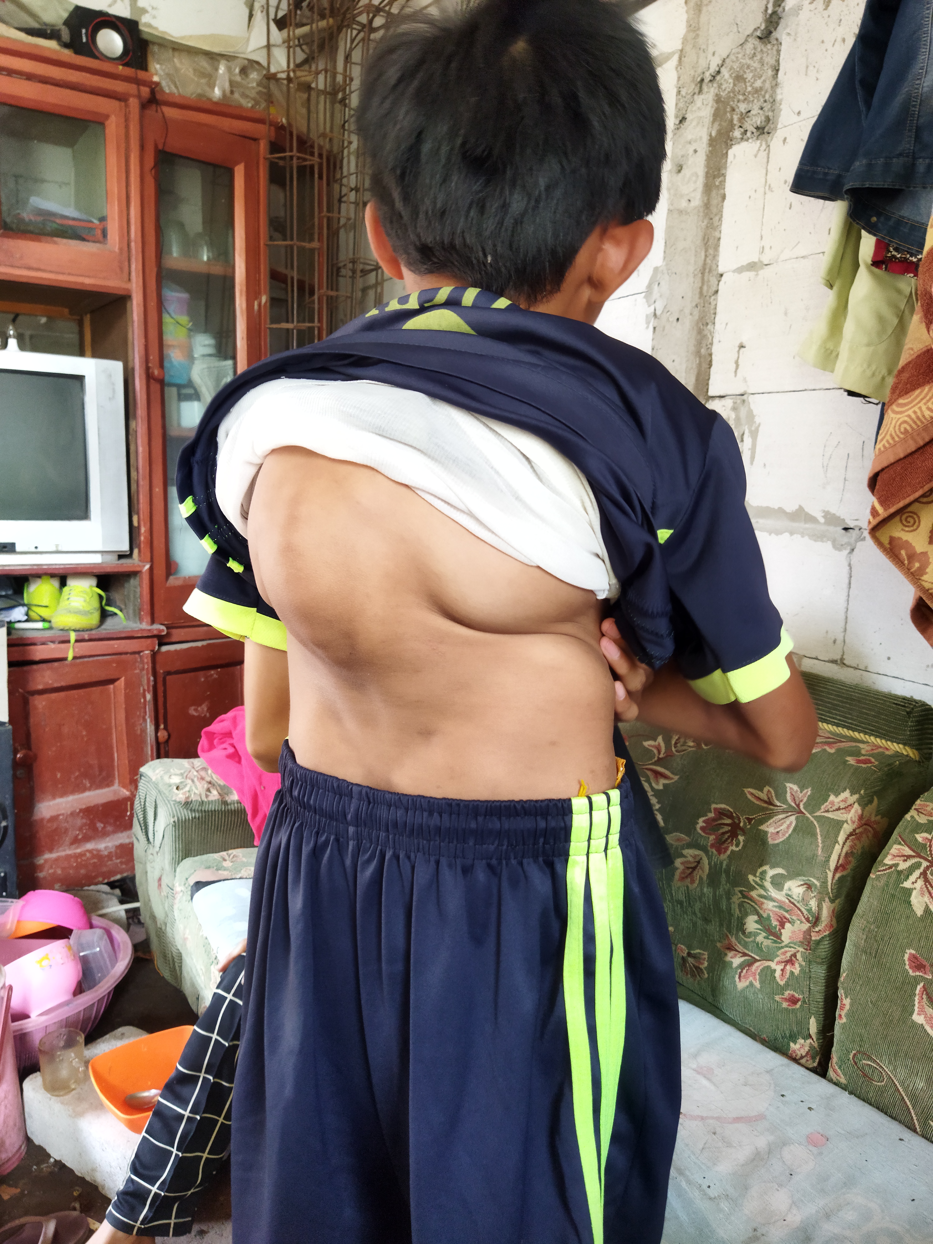 Sahrul Hanapi (15) terjatuh saat usianya 2 tahun dan mengenai tulang ekornya. Saat itu, Hanapi hanya bisa dibawa ke tukang urut. Namun lama kelamaan kondisinya semakin parah, hingga tulang punggungnya bengkak dan terus membesar.