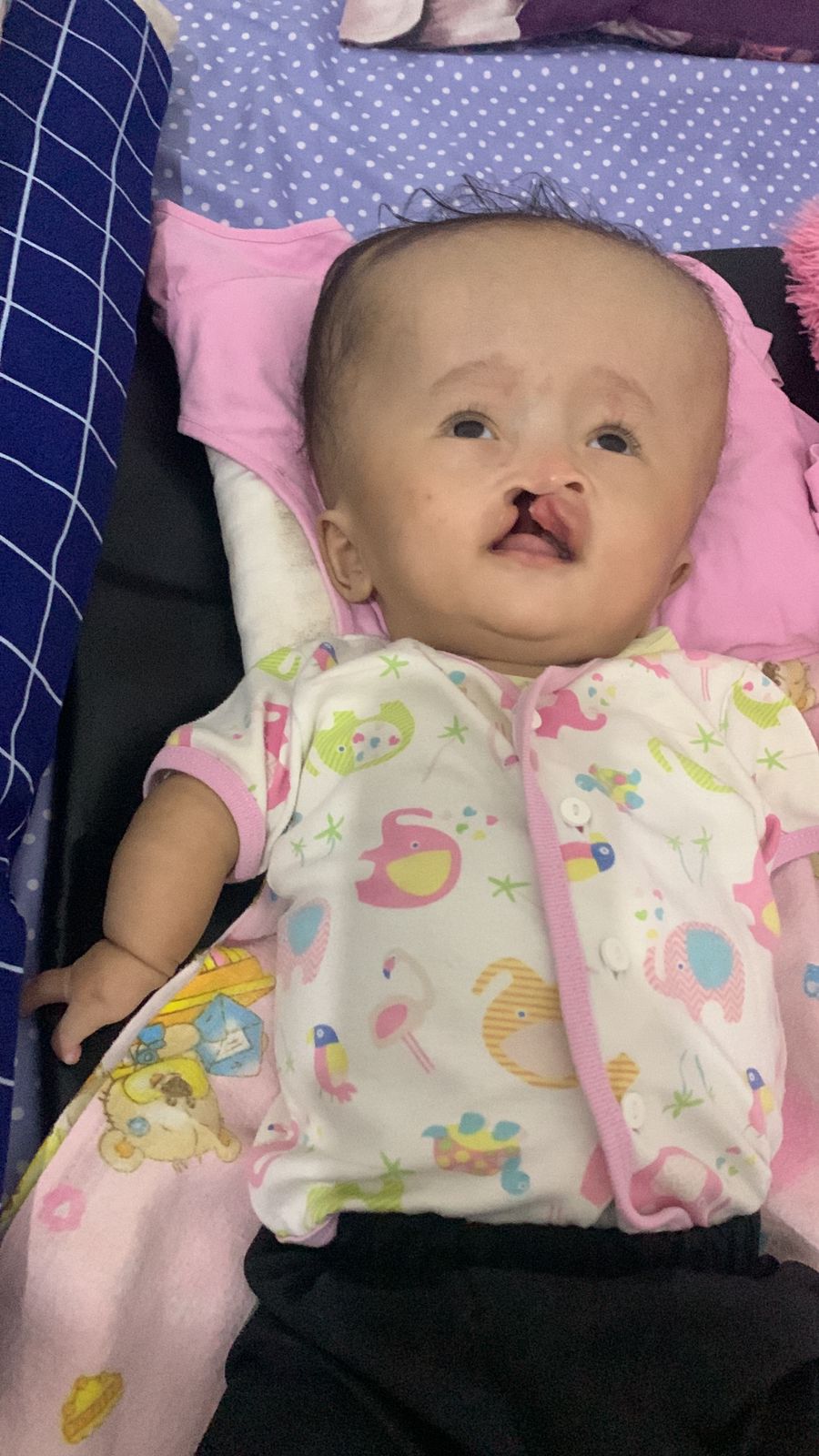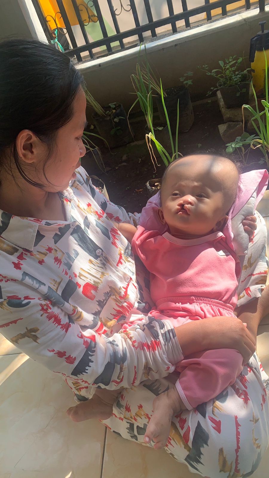 Sarah… Adik mungil itu kini usianya baru 11 bulan. Ia terlahir istimewa; bibirnya sumbing, tak miliki tangan kiri dan jemari tangan serta kakinya pun tak lengkap. Tak hanya itu, Sarah mengidap hidrosefalus .