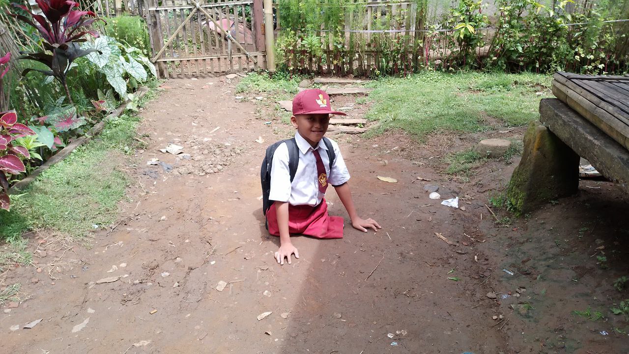 Syahroni sekolah kelas 1 SD karena sebelumnya dia tidak mau sekolah karena merasa minder dengan kondisi fisik nya yg memilki kekurangan, tetapi setelah dibujuk oleh ibu kepala desa setempat akhirnya mau sekolah.