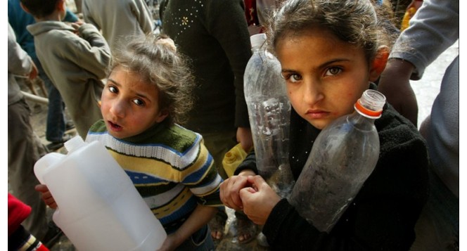 Anak-anak Palestina terlihat mulai minum dari genangan air yang ada di jalanan.