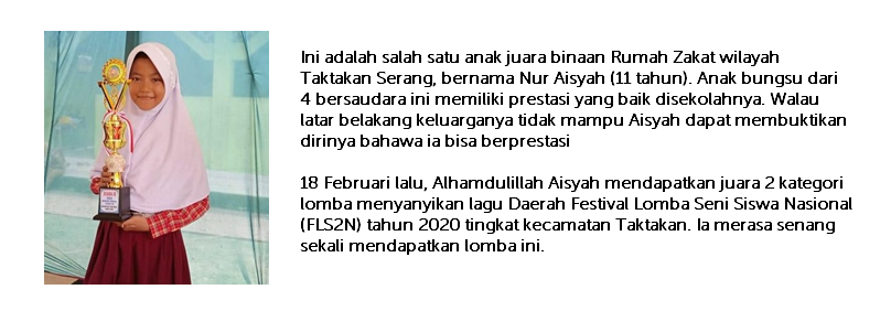 Dan untuk mewujudkan Kebahagiaan Anak Indonesia, Rumah Zakat mengajak #HappyPeople menyediakan Beasiswa Juara bagi 100.000 anak-anak yang membutuhkan dari Aceh hingga Papua. Pemberian beasiswa ini nantinya disertai kegiatan pembinaan berkala untuk siswa SD, SMP, SMA, dan Mahasiswa dari keluarga kurang mampu.