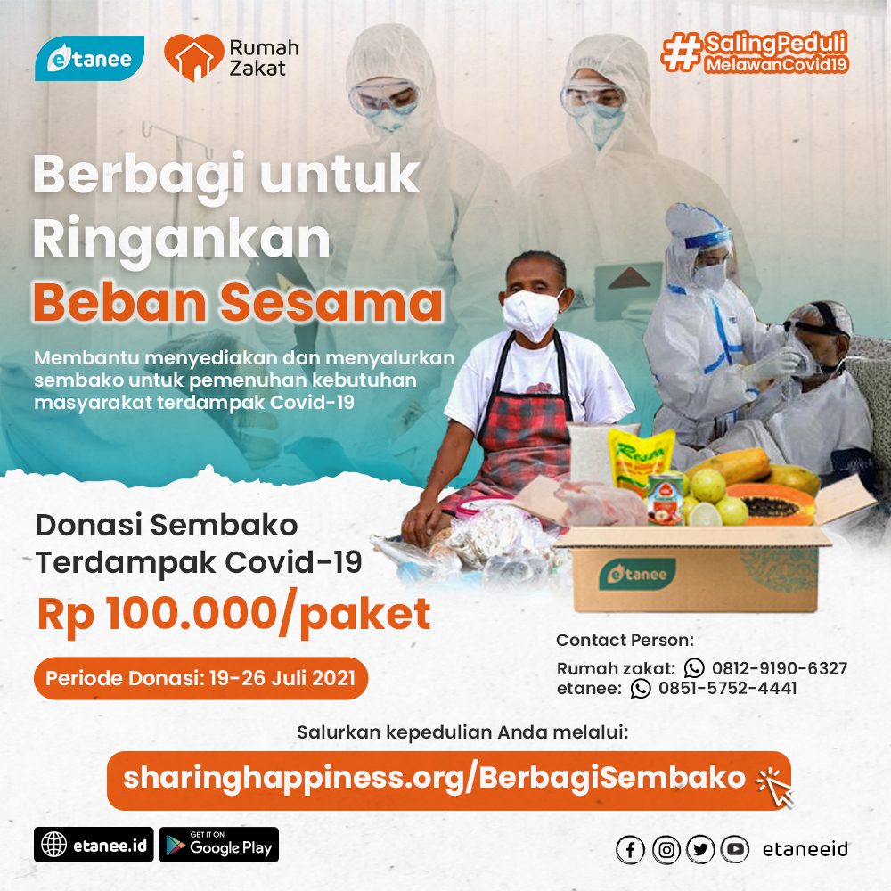 Sebagai wujud kepedulian atas masalah ini, Rumah Zakat Bogor bersama etanee menginisiasi program #BerbagiSembako untuk membantu masyarakat yang terdampak Covid 19 terutama bagi yang menjalankan isolasi mandiri dan tidak dapat keluar rumah.