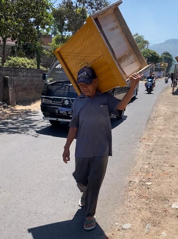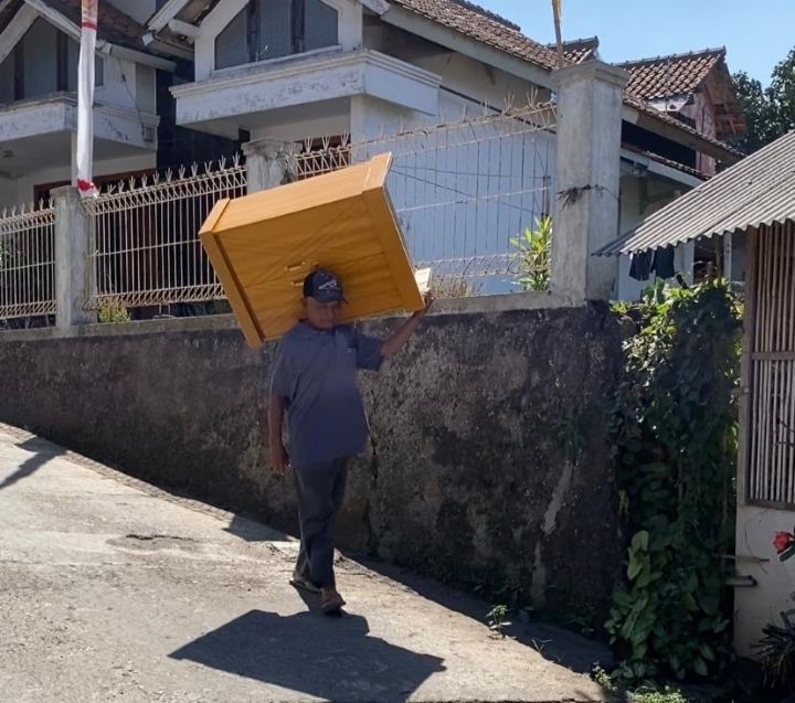 Raut wajahnya tampak kelelahan memikul lemari kayu yang tampak berat tersebut. Bayangkan lemari yang dipikulnya kurang lebih 20kg. Abah lakukan demi hidupi dirinya dan sang istri di rumah.
