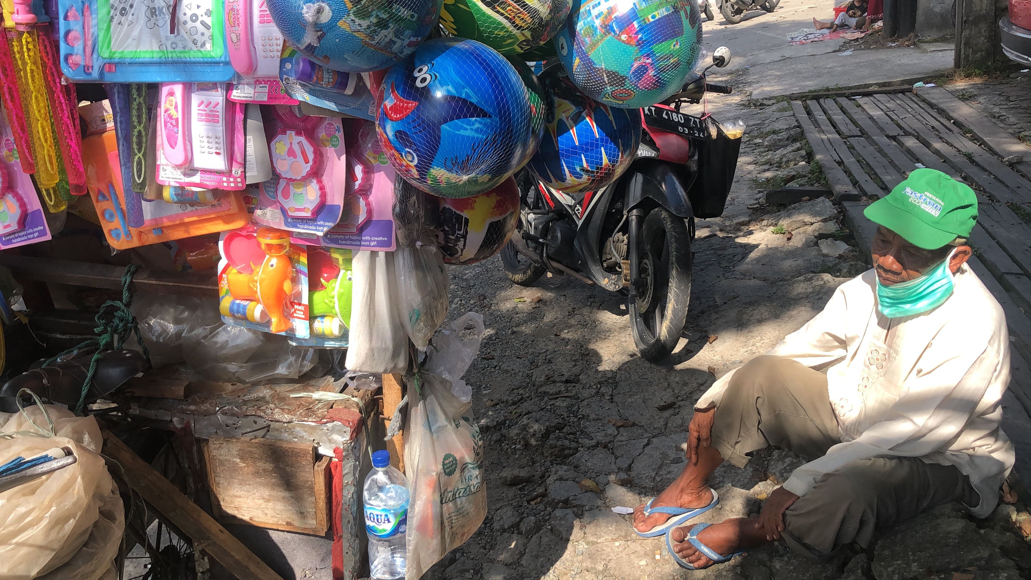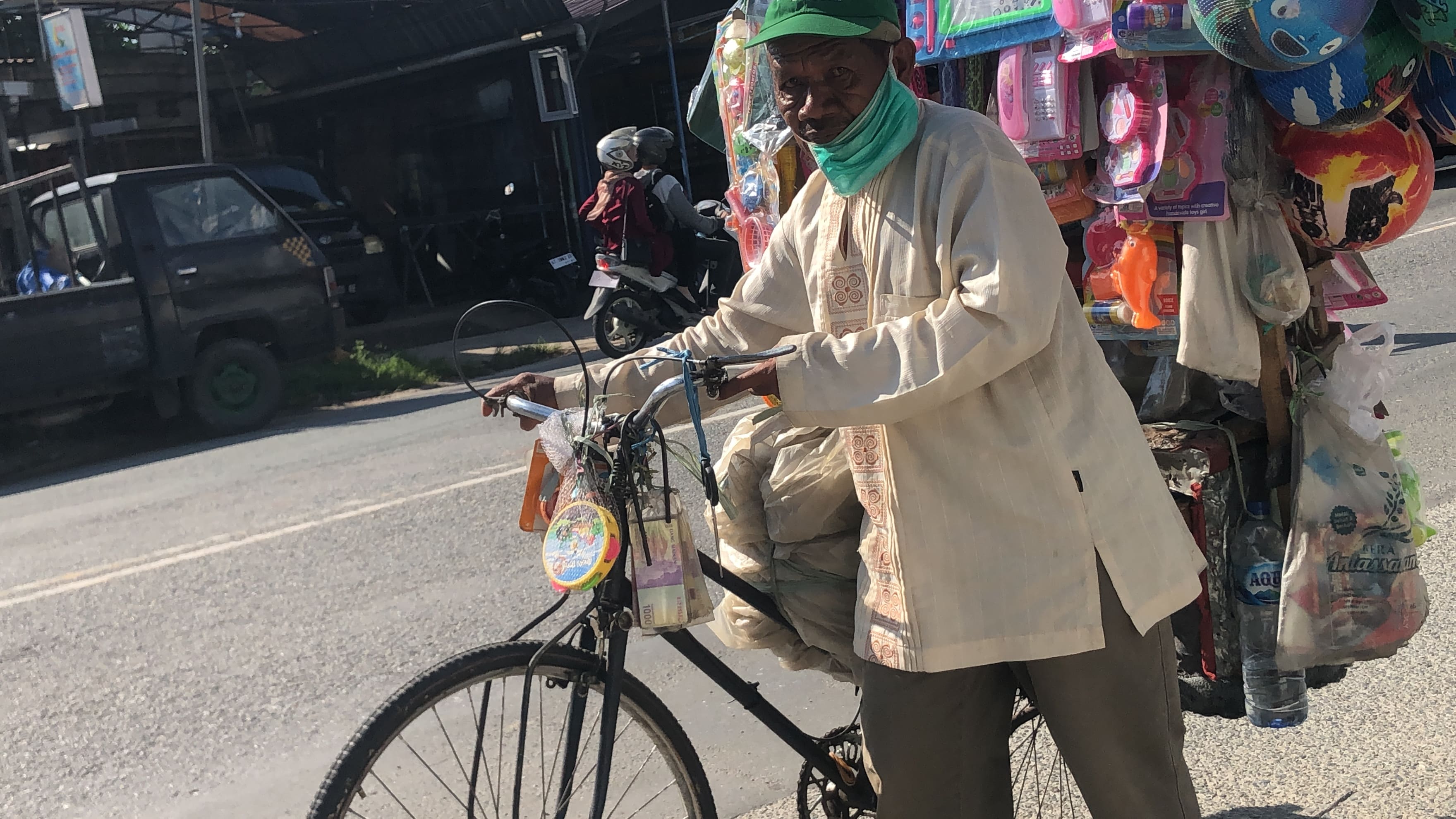 Setelah sedikit berbincang dengan beliau. Beliau penjual mainan keliling. Sudah berjualan sejak 32 tahun yang lalu. Awalnya beliau berjualan menggunakan pikulan, hingga kini beliau bisa berjualan dengan sepeda yang tidak bisa dikatakan masih bagus.