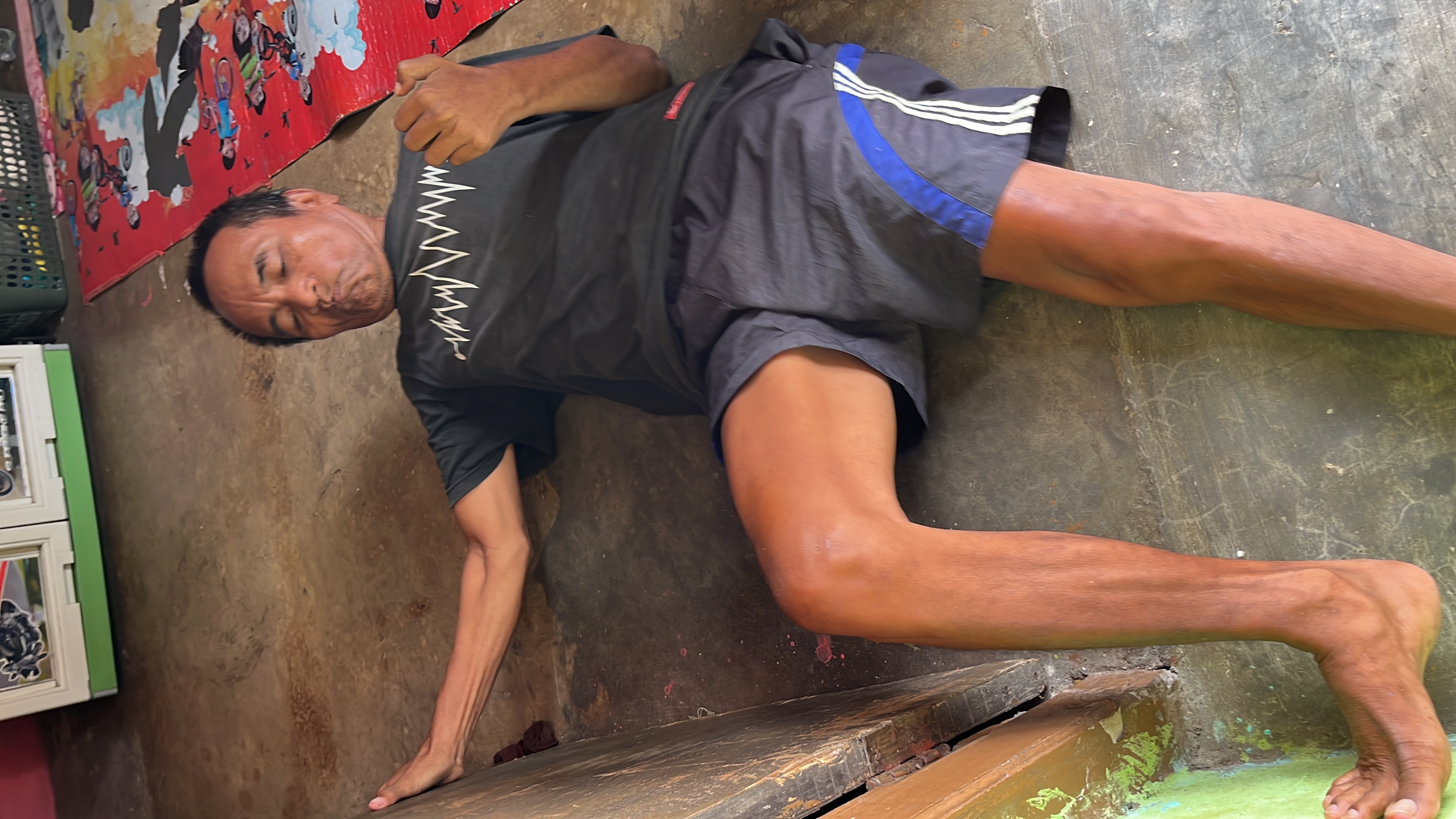 Abah Beben (59) terkadang harus menggunakan punggungnya untuk berjalan dan dibantu Mak Oneng (58) dengan cara diseret menggunakan kain sarung.