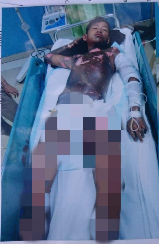 Tidak lama timbul percikan api yang langsung mengenai tubuh Riski dan membakar pakaian yang dikenakannya. Lebih dari 50% tubuh Riski mengalami luka bakar.
