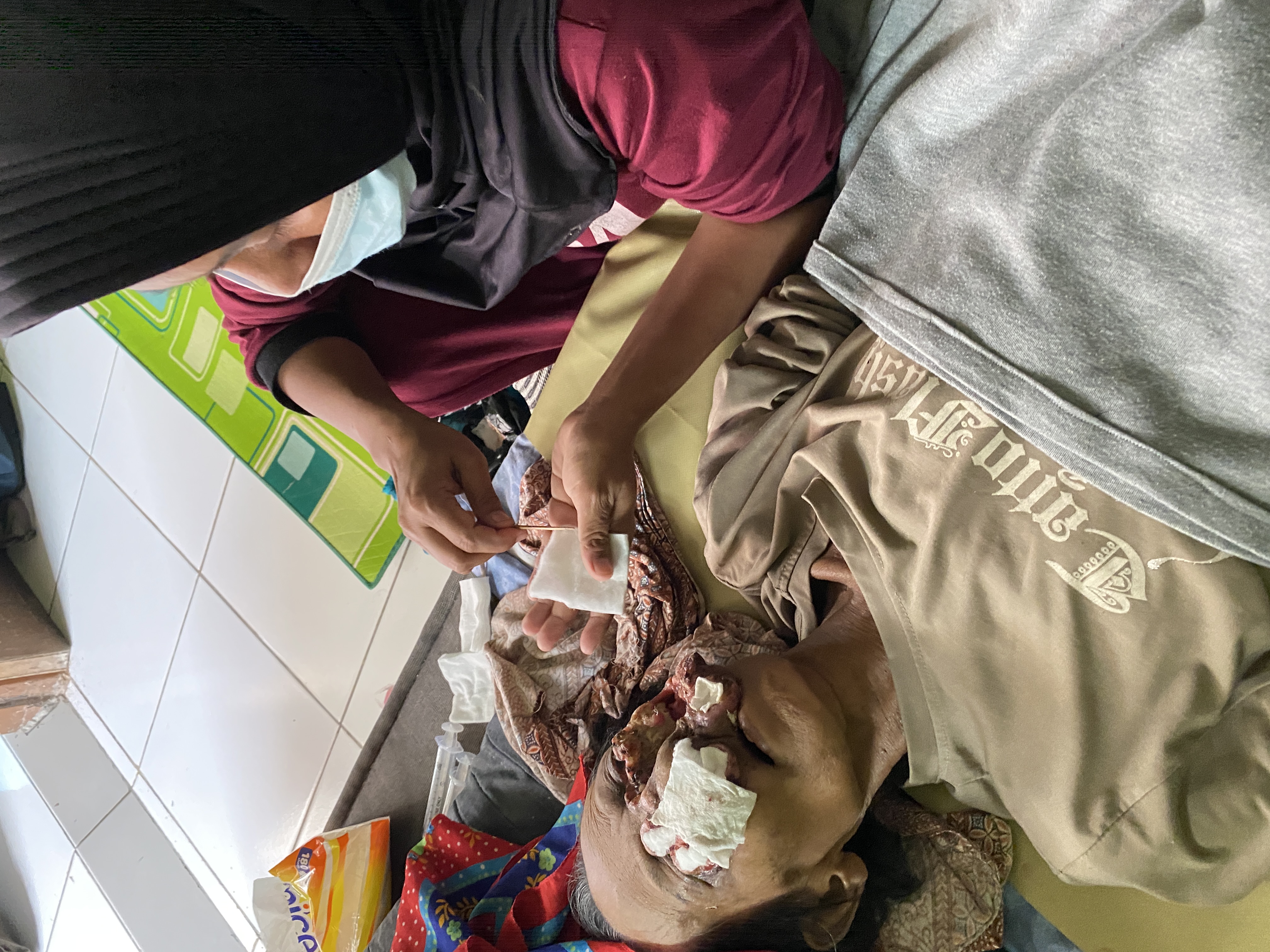 “Mak nafas juga susah. Badannya makin kurus soalnya susah makan karena mulutnya udah hampir semua ketutup kanker. Sepanjang hari mak kesakitan, apalagi kalo lukanya lagi dibersihin,” ucap Ibu Kartini, anak Mak Nani.