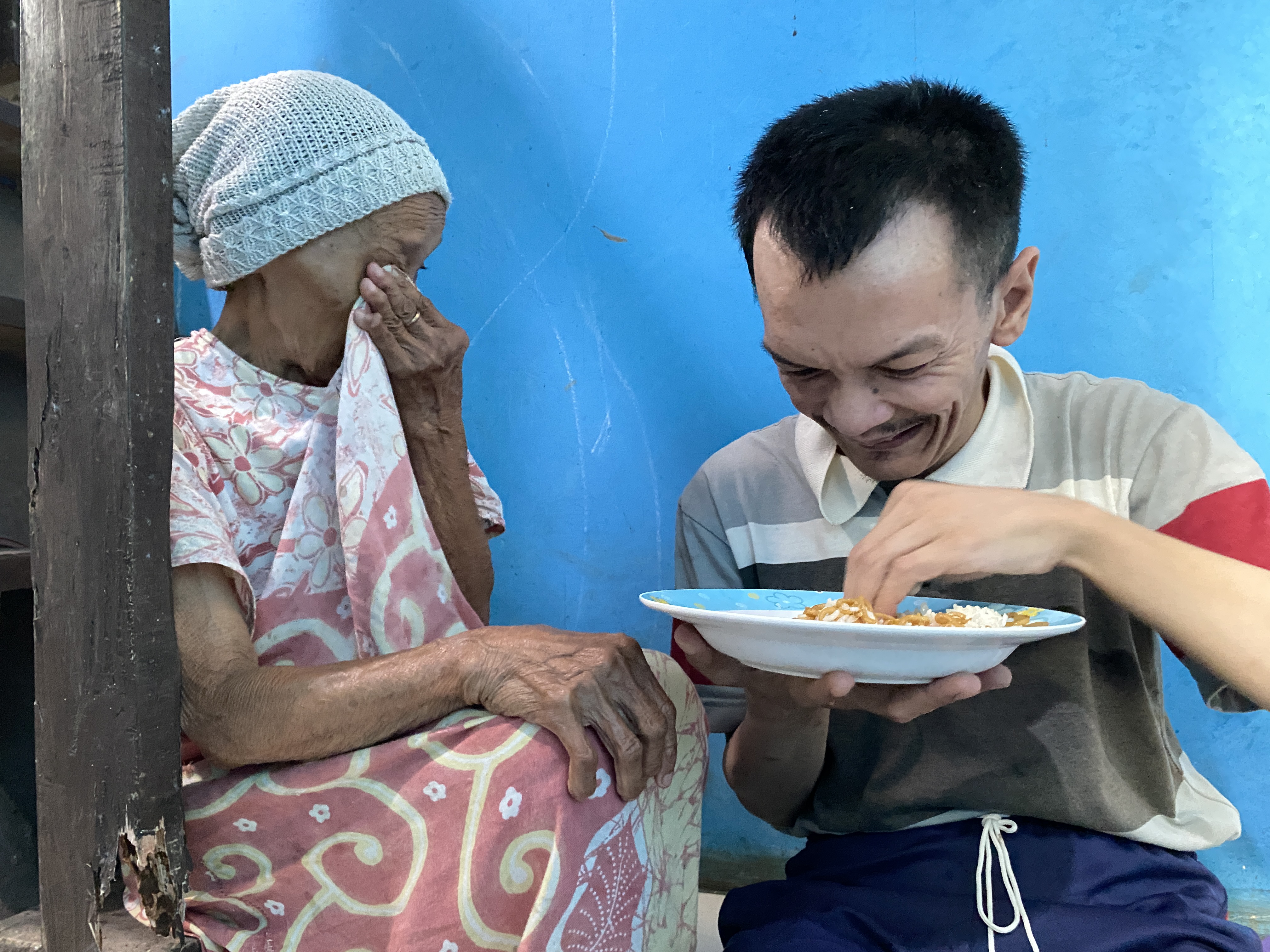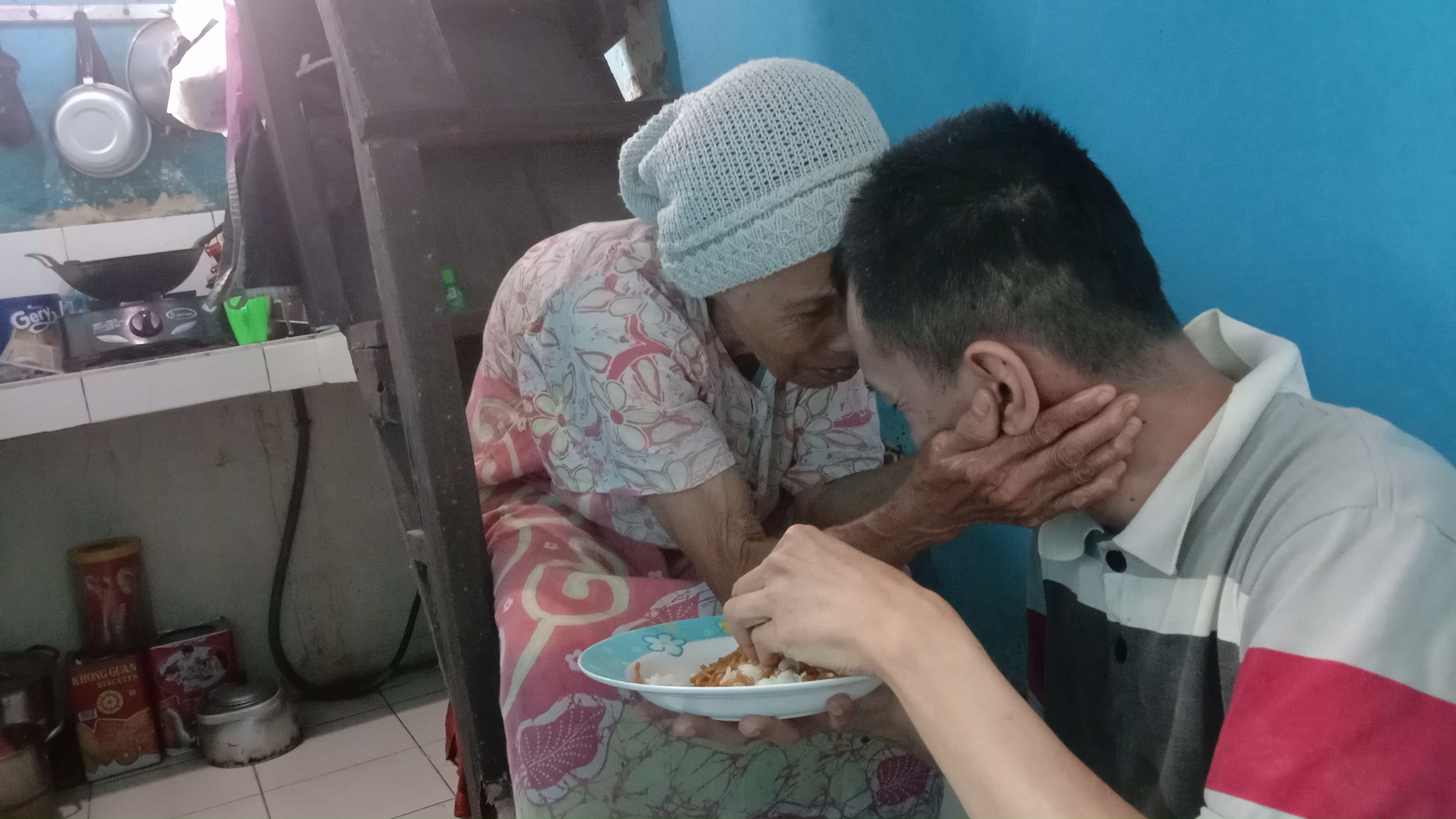 Dengan keadaannya yang seperti ini, Mak Supiah yang 72 tahun terkadang masih harus menyuapinya makan dan membantunya melakukan banyak hal. Mak Supiah terus menerus mengajarkan keterampilan hidup dasar yang sama : makan, cuci tangan, mandi, sikat gigi, setiap hari, selama puluhan tahun.