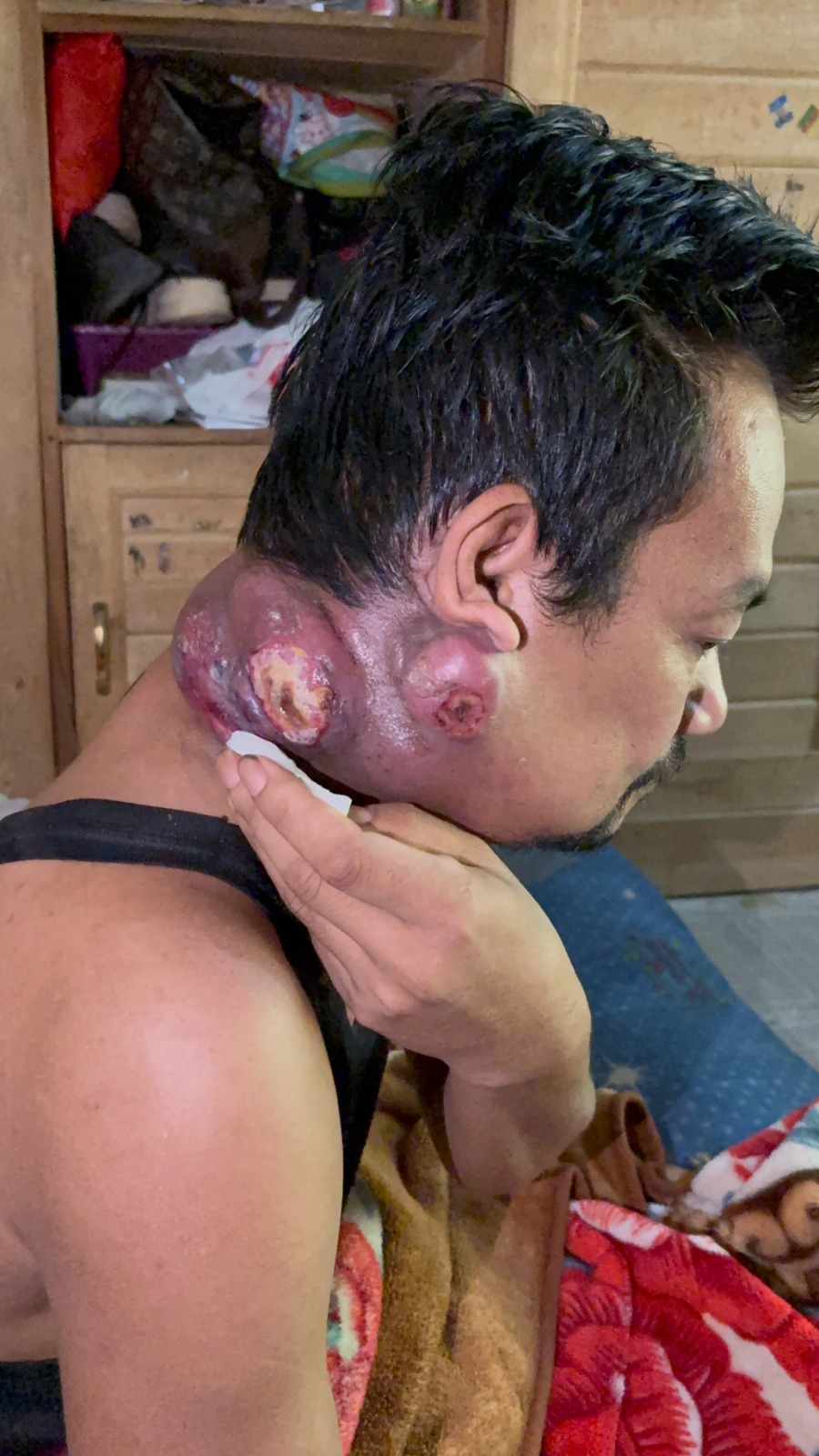 Tumor di lehernya ini pertama kali muncul sejak 3 bulan yang lalu dan sejak dilakukan biopsi pertama tumor ini terus membesar. Dua kali ia gagal operasi karena keterbatasan biaya dan komplikasi medis. Kini, tumor tersebut mengganggu pernafasan dan penciumannya.