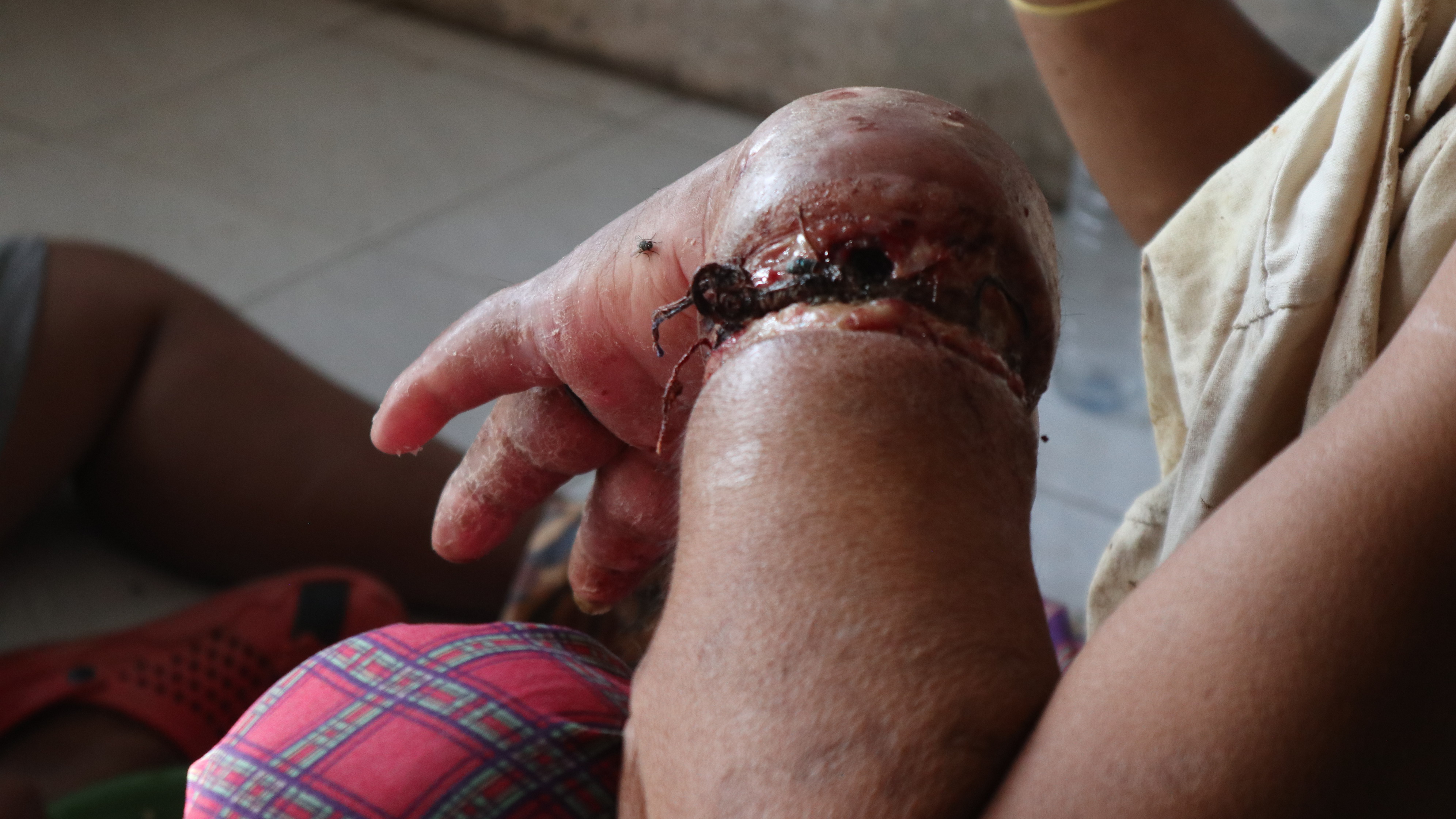 Sebagian jari terlihat sudah tak tertutup daging dan kulit. Tangan kirinya mengeluarkan bau busuk akibat dagingnya telah membusuk. Kawat yang mengikat lengannya telah mengiris kulit dan daging di lengannya hingga mencapai tulang dan mesti dilakukan operasi untuk melepaskanya.