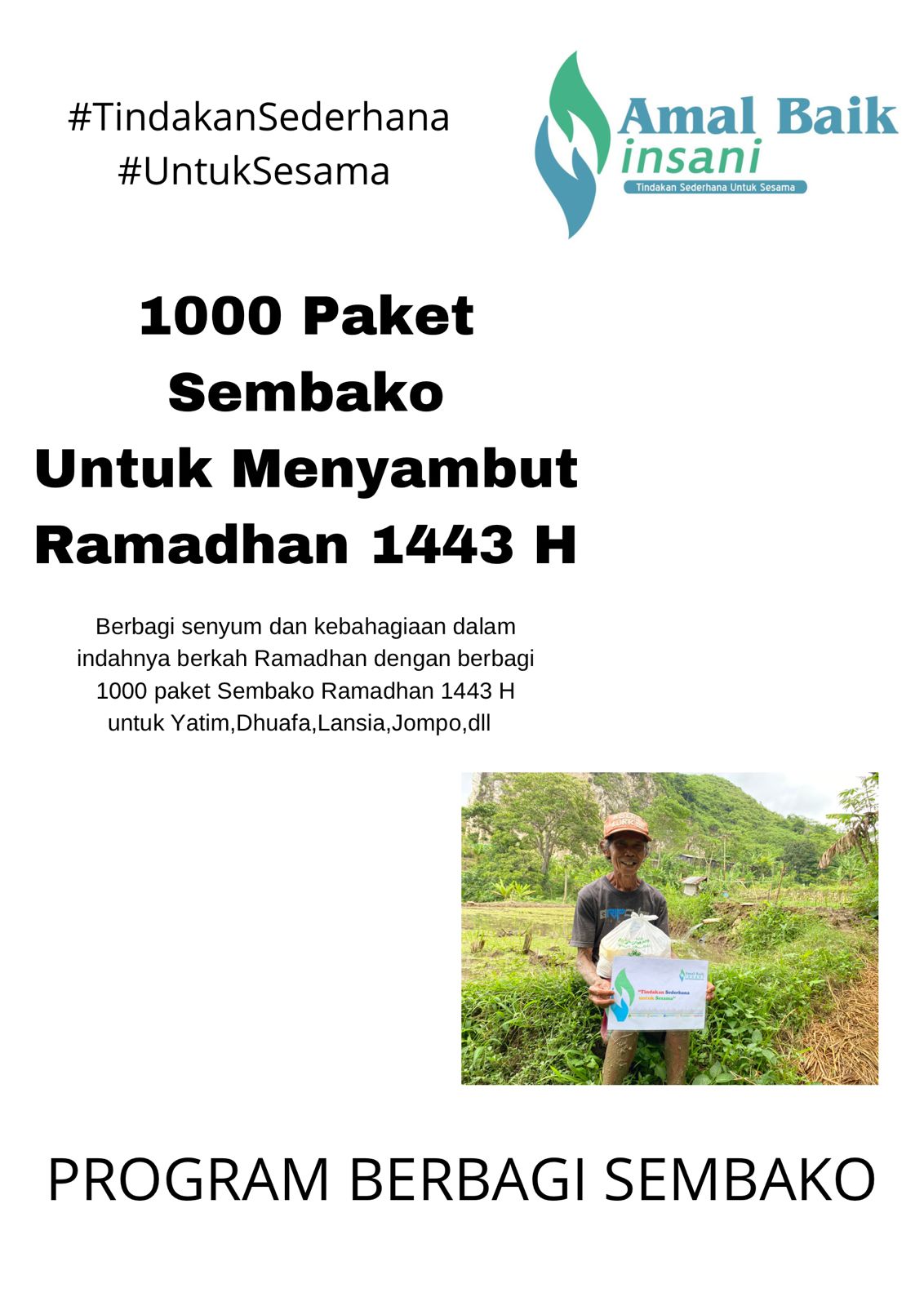 Ramadhan 1443 H sebentar lagi tiba. Amal Baik Insani menemani Ramadhan Anda untuk mencari keberkahan dan cinta Allah SWT melalui program Berbagi Ramadhan untuk Yatim,Dhuafa,lansia,Jompo,dll.