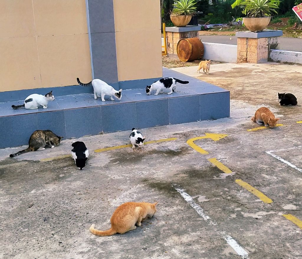 Di Kamis pagi yang sepi di Masjid Al-Fatihah Unmul, kucing-kucing ternyata sudah antri mengais rejeki.
