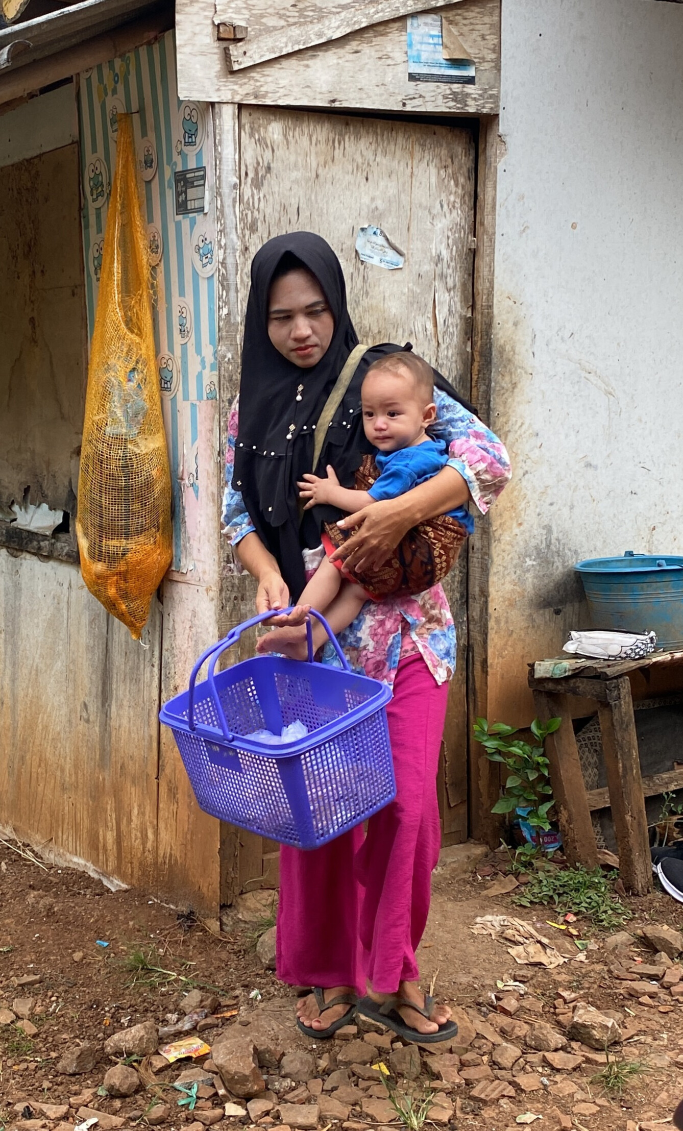 Ibunya, Bu Nunung (38) berjuang untuk kesembuhan anaknya. Setiap hari berjalan puluhan kilo sambil menggendong Basri untuk menjajakan cemilan yang ia ambil dari orang dengan upah 10ribu/hari itupun jika dagangannya habis terjual.