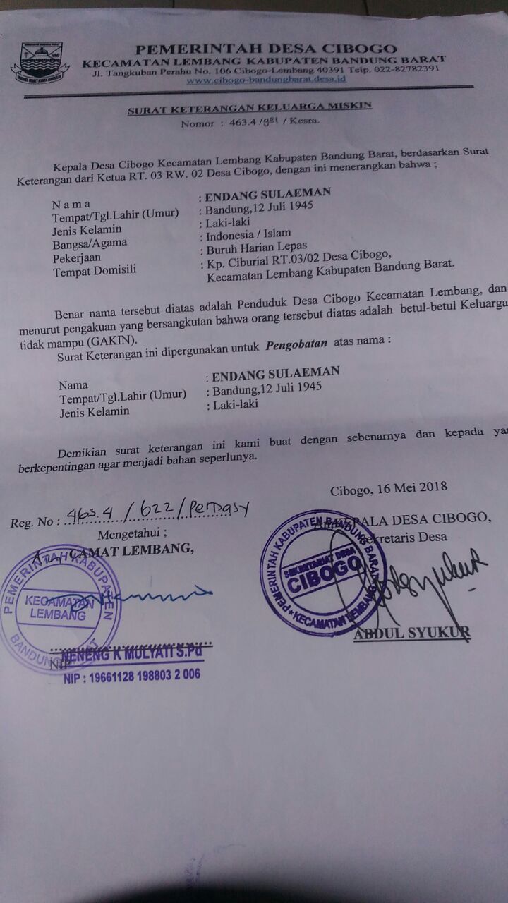 Bapak Endang saat ini bekerja hanya sebagai buruh usaha jual beli sayuran, membeli dari kebun dan menjual ke pangepakan untuk dikirim ke hotel atau supermarket. Keadaan ini lah yang menyebabkan pak Endang tidak mampu membayar biaya pengobatannya.