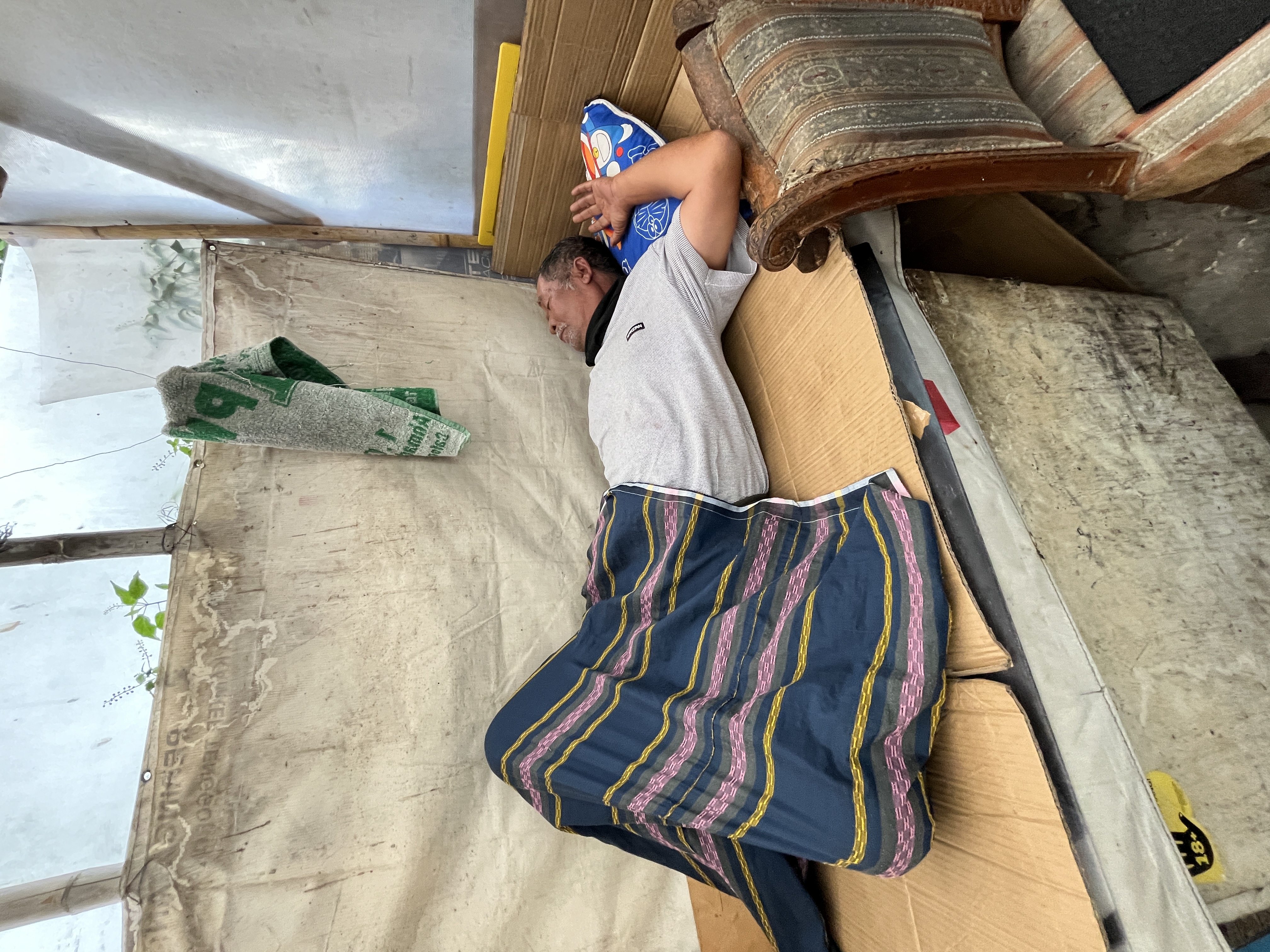 Meja dan kardus menjadi tempat tidur Abah setiap harinya, sudah lebih dari 12 tahun Abah menumpang tidur di sebuah warung. Cuaca dingin pada malam hari sudah biasa Abah hadapi ketika tidur.
