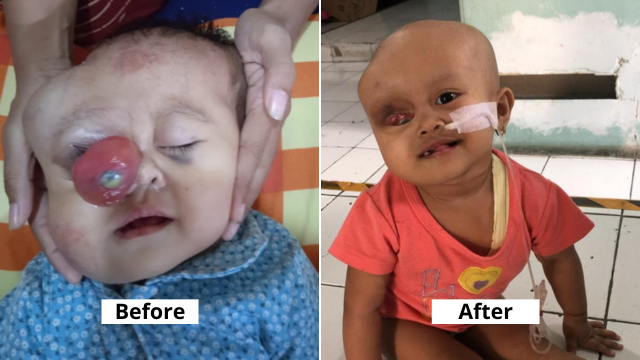 Kondisi awalnya bentuk wajah Aleeza tak lagi normal. Di saraf mata kanannya bersarang kanker yang membuat bola matanya merah dan menonjol ke luar sehingga membuat bentuk kepalanya membesar hingga mengubah keseluruhan bentuk wajahnya.
