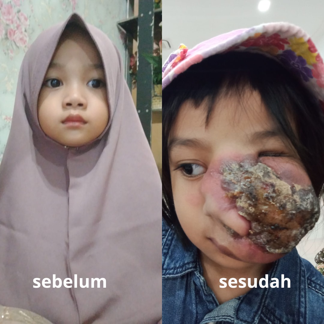 Berawal dari bulan Oktober 2020, di pipi sebelah kiri terdapat benjolan kecil dan semakin hari semakin membesar dengan sangat cepat. Aku merasakan sakit yang luar biasa hingga aku merintih kesakitan dan membuat ibuku sedih. Aku tidak suka melihat ibu menangis, tapi aku tidak bisa menahannya.