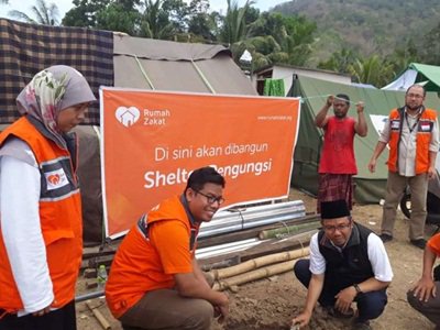 Rumah Zakat berinisiatif untuk mendirikan pembangunan 50 shelter di tahap pertama bagi para korban di wilayah Lombok Utara. Pada hari senin (20/08) , CEO Rumah Zakat Nur Efendi bersama Bupati Lombok Utara Najmul Ahyar melakukan peletakan batu pertama pembangunan hunian sementara di pos pengungsian di Dusun Menggala, Desa Pemenang, Kecamatan Pemenang, Kabupaten Lombok Utara. Selain itu Rumah Zakat juga bekerja sama dengan beberapa pihak untuk mendirikan shelter. Harapannya shelter-shelter lain dapat didirikan juga di beberapa titik lainnya. Semua dilakukan bertahap karena untuk membangun 1 buah shelter memerlukan biaya yang cukup besar, yakni 12,5juta/shelter.