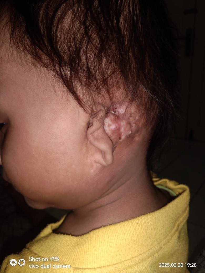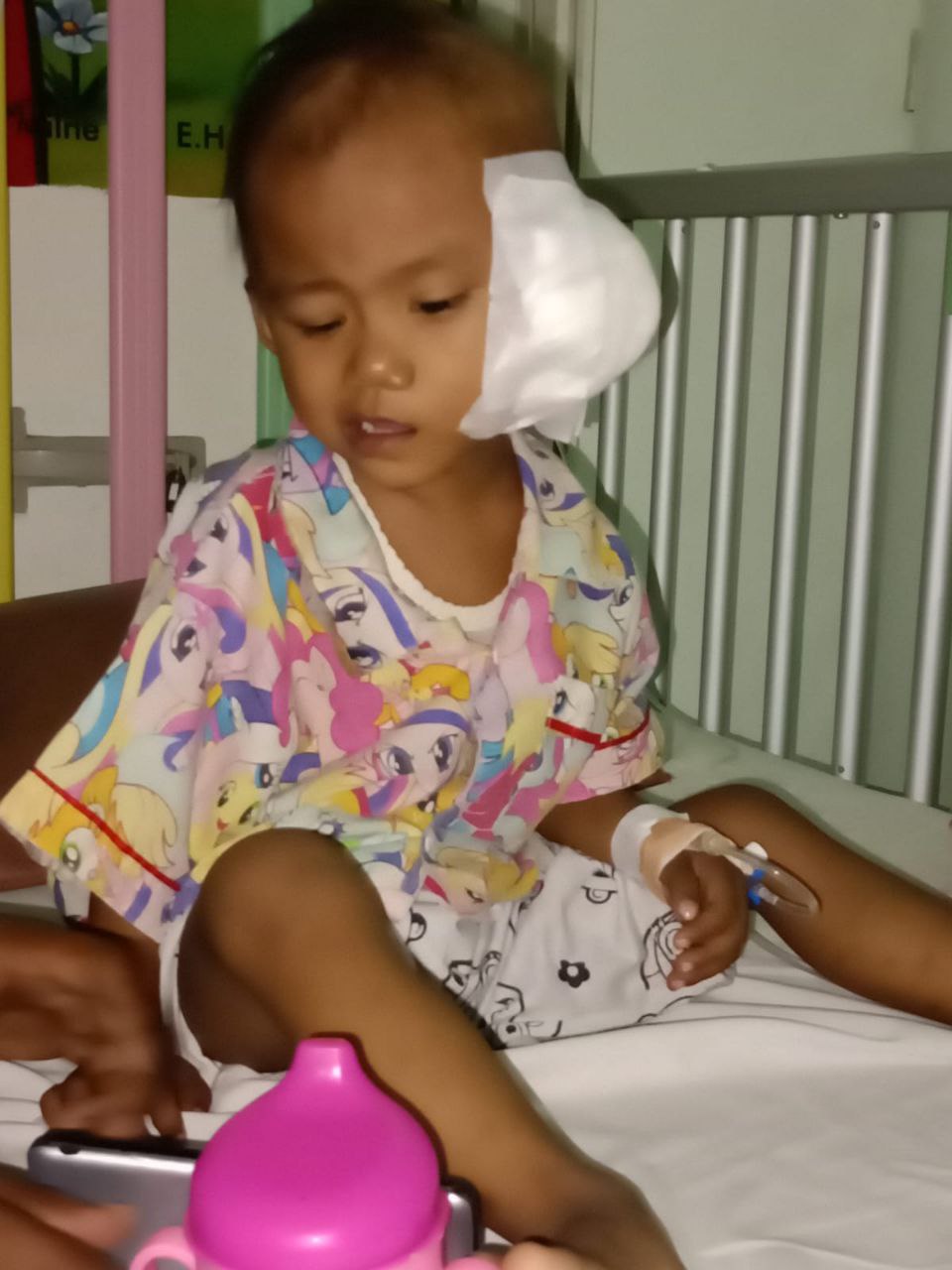 Arlita balita (2 tahun) harus menahan rasa sakit karena menderita tumor CAE Auris Sinistra + Mastoiditis sinistra sebesar telapak tangan orang dewasa.