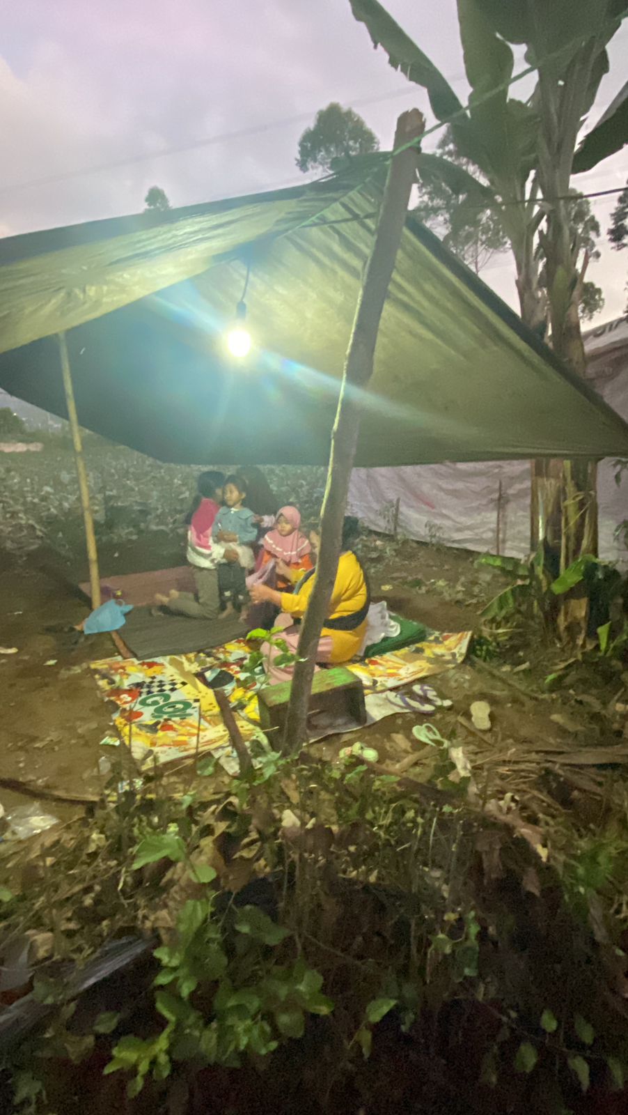 Rumah-rumah warga runtuh mengharuskan warga membuat tenda mengungsian sementara.