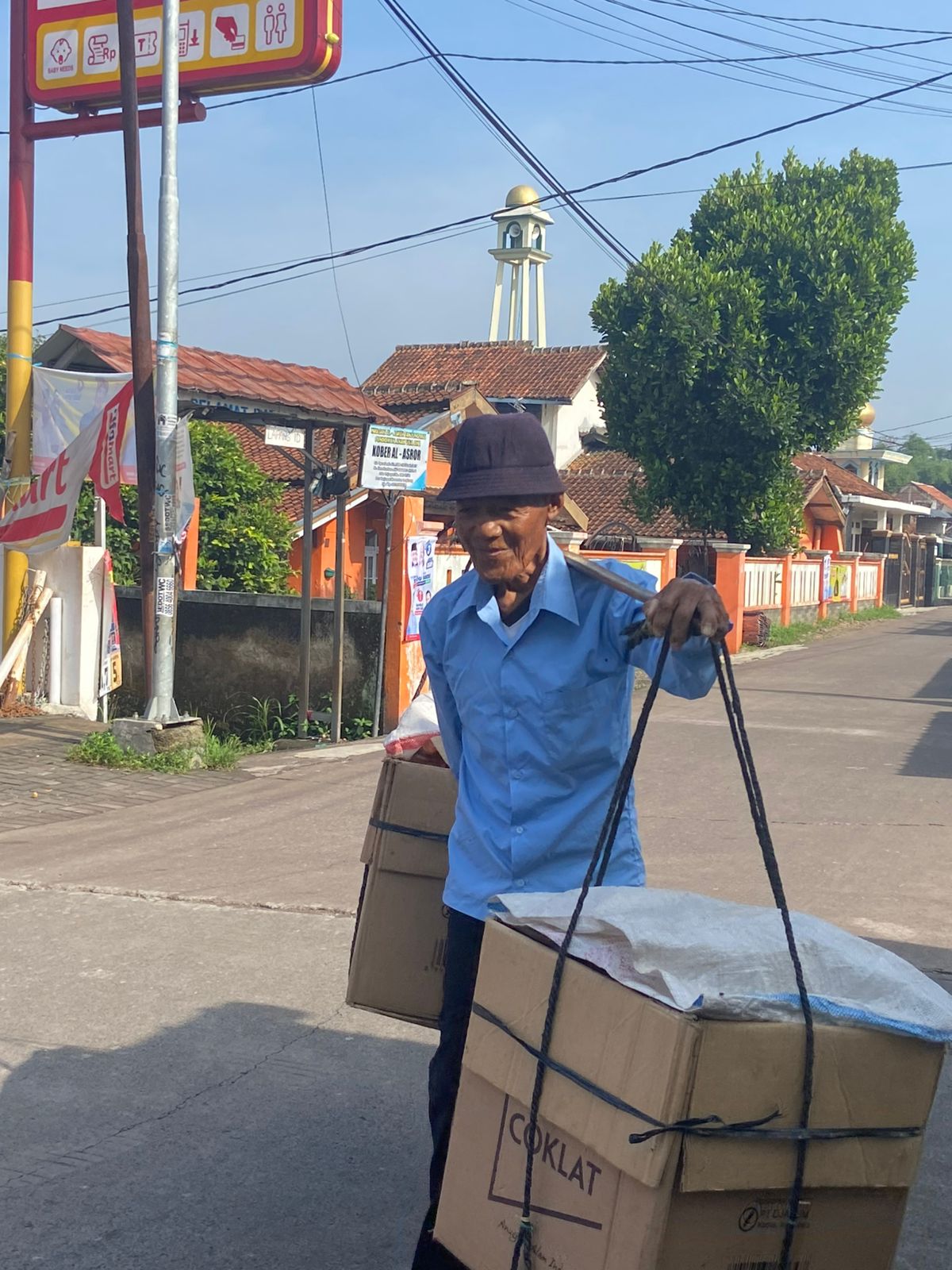Yang menjadi perhatian adalah ia menggunakan 2 kardus besar yang ia ikat dengan tali dan diikatkan kembali pada pikulan bambu.