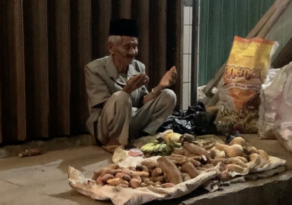 Di emperan trotoar jalan tepat pukul 05.00 wib terlihat lansia yang sedang tertunduk tidur sambil menunggu jualannya. berharap ada yang membeli namun belum ada satupun pembeli yang menghampiri.