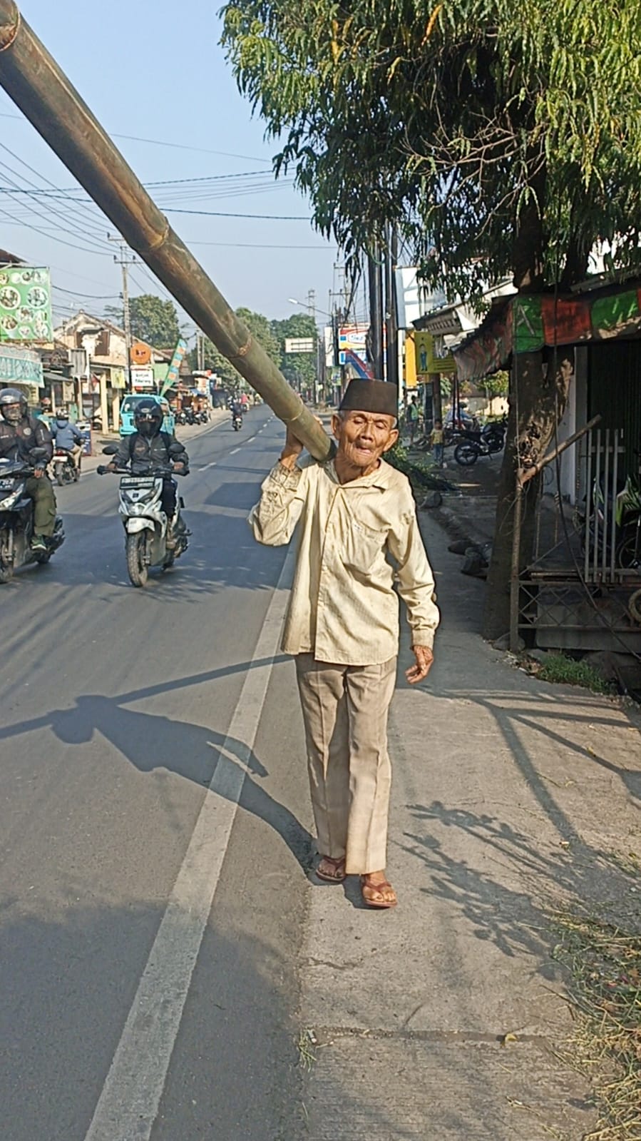 Beliau bukan buruh bangunan yang sedang memindahkan bahan bangunan, tapi justru beliau sedang berkeliling mencari orang yang barangkali membutuhkan bambu tersebut.