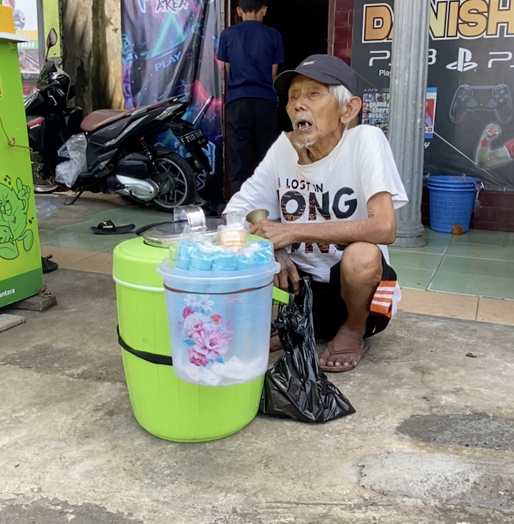 Usianya sudah tua dan renta, namanya Abah Udin (87 tahun) masih harus berjuang mencari rezeki. Sudah puluhan tahun Abah jualan es ini, dulu Abah membuatnya sendiri tapi sekarang tenaganya sudah tak kuat lagi. jadi Abah cuma jualin punya orang (Nyenteng).