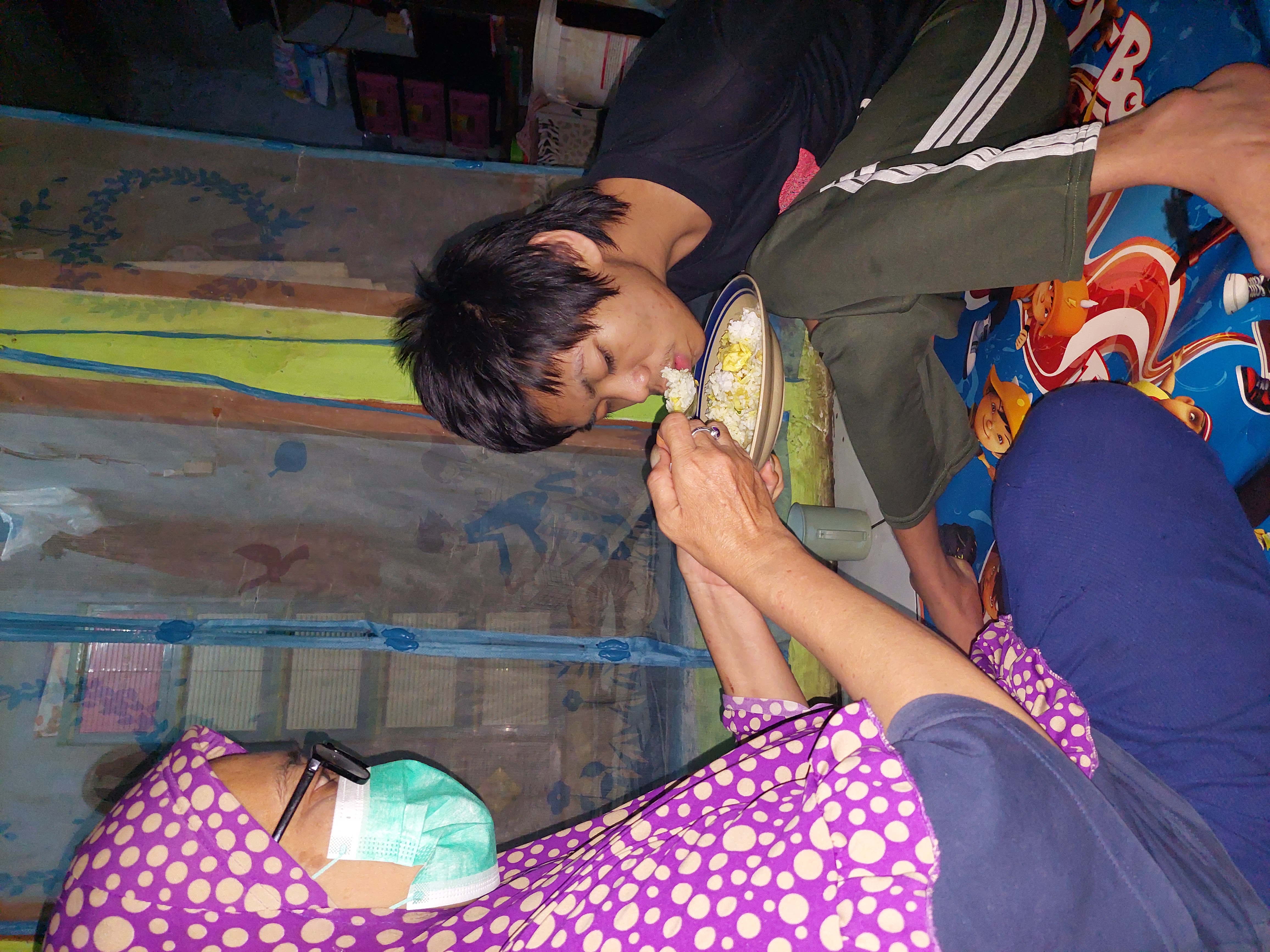 “Mulai dari mandi, BAB, dan makan Akmal semua dibantu sama Ibu, kalo dulu tidak sulit karena masih kecil dan dibantu sama Kaka nya juga, kalo sekarang kan duhh susah udah gede dan tenaga ibunya ga kuat sudah tua.” Ucap Bu Yanti.
